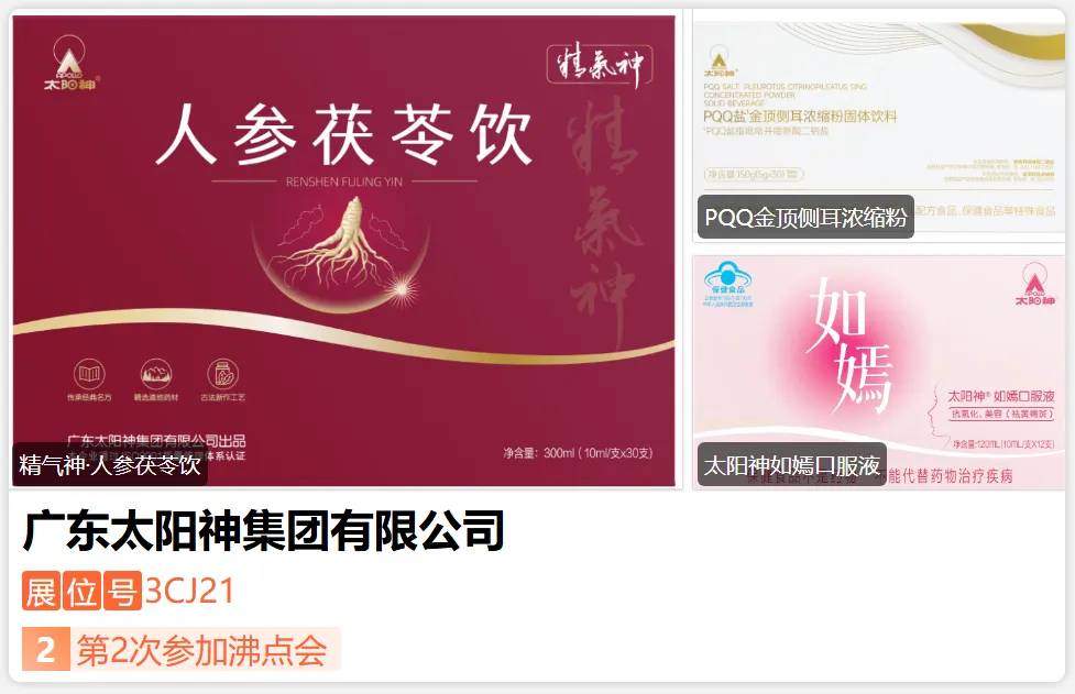 太阳神集团创立于1988年,是集研发、生产、销售于一体的中外合资企业,致力打造高品质的健康产品。重视品牌建设,太阳神率先在中国大陆导入CI,创造了保健品同类产品63%的市场占有率纪录;注重产品科技创新,与国内众多科研院所及高校合作,现已拥有逾 200款产品,其中太阳神口服液销售超过100亿支,30多年来产品零安全事故。未来太阳神将不断探索新经营渠道,融合新元素,创造新机会!-展位号:3CD13-