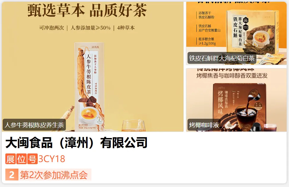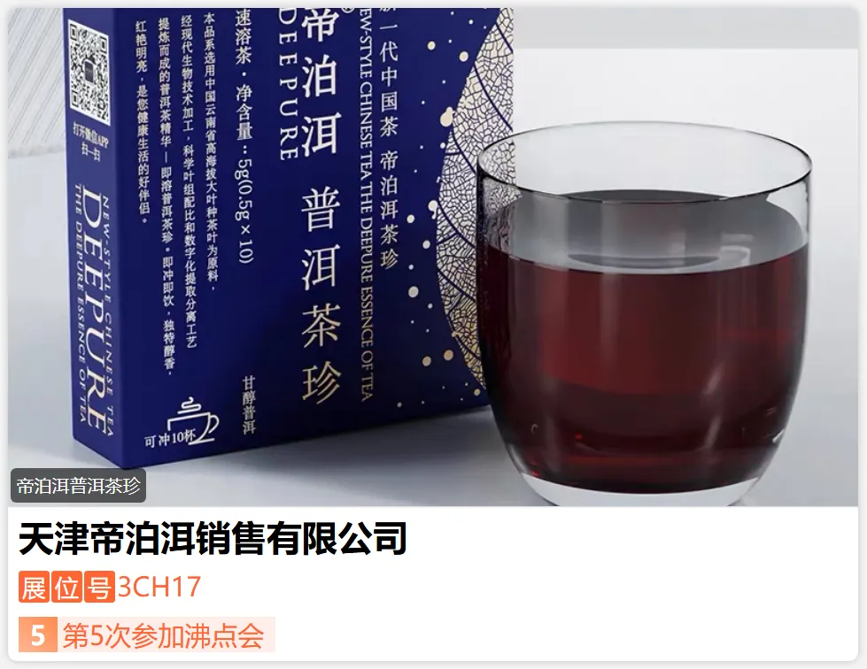帝泊洱连续三年入选国家强国工程品牌。我国速溶茶行业标准的制定者;云南普洱市自有茶园和工厂,占地792亩,投资40亿元;荣获中国首批“国家工业旅游示范基地”2018年通过国家AAAA级景区认证;37项发明专利;477项农残0检测,获得中、美、日、欧有机认证,以及国际通用清真许可认证;包装斩获Muse国际创意大奖铂金奖&德国IF设计奖。-展位号:3CA21-