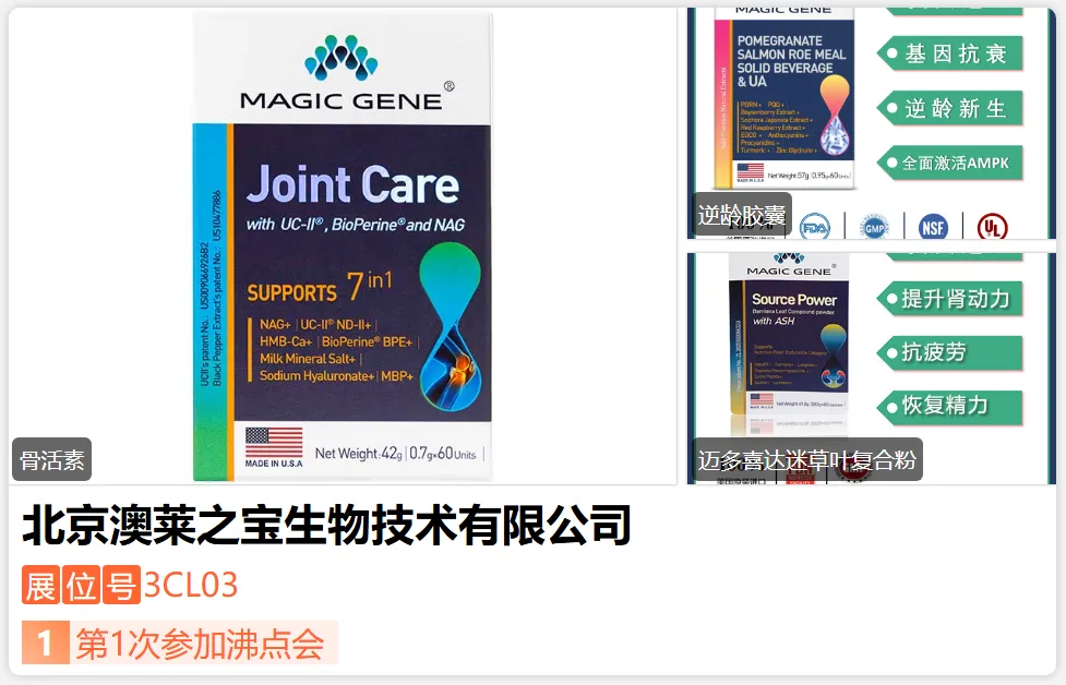 北京澳莱之宝生物技术有限公司是一家专注于进口膳食营养品供应的企业。公司拥有四十多条核心产品线,覆盖肌骨养护、耳脑健康、免疫调节、心脑血管调理、血糖管理等多领域。秉持专业严谨态度,企业既为消费者提供针对性营养方案,也可为合作伙伴提供定制化解决方案,助力其提升营业额。公司以拓展业务网络为方向,以提供卓越产品与服务为宗旨,致力于成为行业领先供应商,服务更多客户伙伴,为消费者打造全面健康解决方案。-展位号:3CX18-