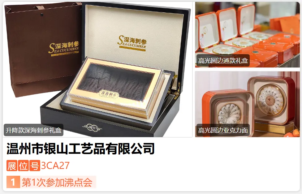 温州市银山工艺品有限公司成立于2006年,坐落于中国商务礼品基地平阳县昆阳镇,主要生产各类工艺品及包装盒。本公司自成立以来在质量、服务上不断下功夫,经过多年的发展,凭借精湛的技术和良好的信誉,成为包装行业的龙头的企业。 同时本公司拥有自己的设计团队,可以为客户量身打造适合自己的产品包装。 本公司自2015年起,开始涉足外贸领域,并取得自营出口权,至今本公司产品已远销欧美、中东等诸多地区。-展位号:3CA25-