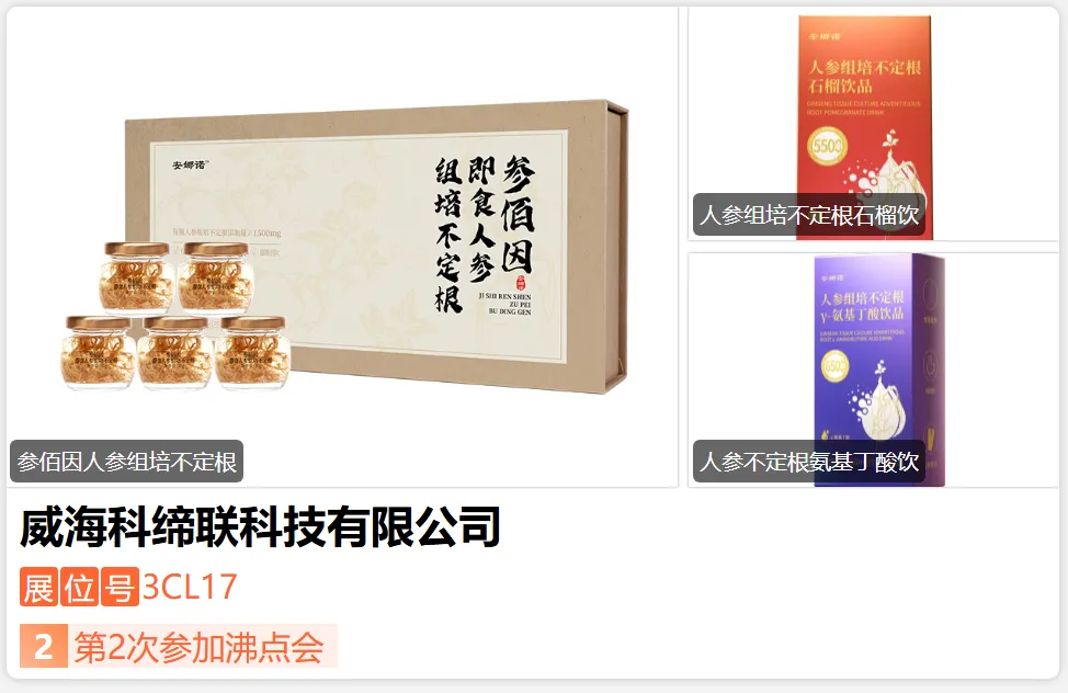 威海松龄中药,国家高新技术企业,山东省专精特新中小企业,专注人参西洋参生产13年,康宝莱(中国)、新时代健康产业等直销企业合作供应商,已通过中药GMP、ISO9001、ISO22000、HACCP等认证。2021年公司牵头起草制定了商务部直属中国医药保健品商会《西洋参提取物》国际商务标准,目前公司发挥中医中药方面的优势,开发出几款功效性西洋参复合饮,效果明显,欢迎莅临展位咨询。-展位号:3CE07-
