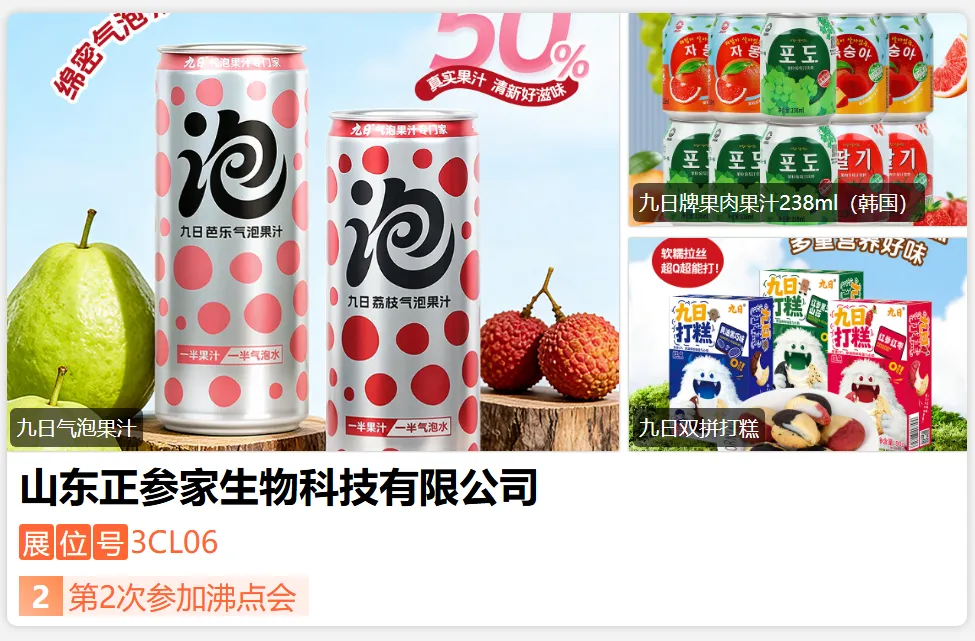 山东正参家生物科技有限公司是九日和环翠楼1736的品牌方,在休闲食品与健康滋补领域深耕16年,集研发、生产、全球供应链、全渠道销售于一体。九日品牌线下覆盖全国主流商超,线上多平台类目热销;环翠楼1736专注高品质红参滋补,复购与口碑双优。双品牌资质齐全、现货稳定、支持一件代发与团单定制,私域合作成熟。-展位号:3CL22-