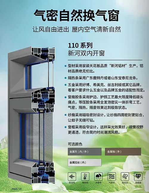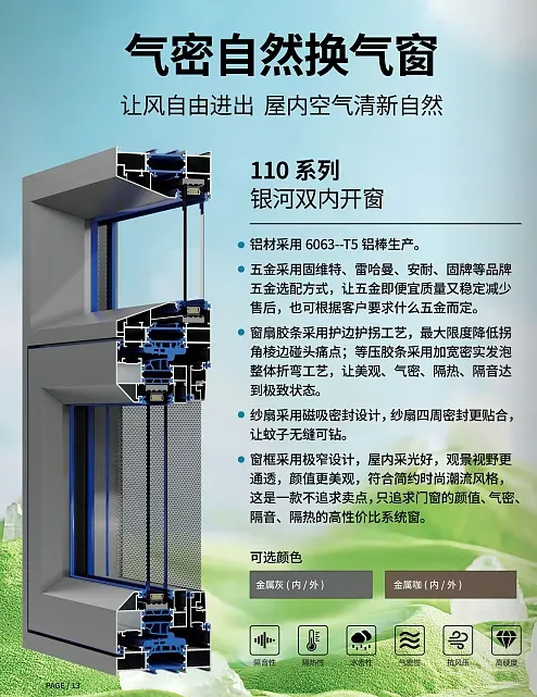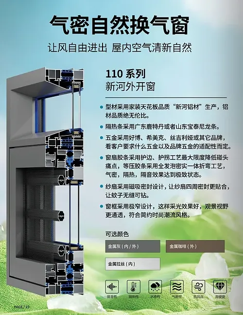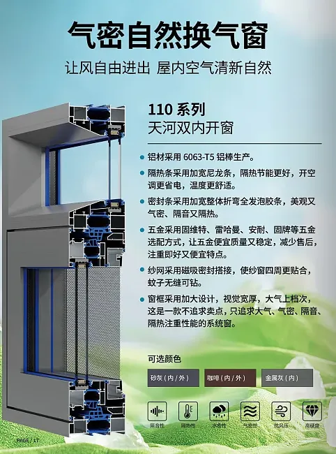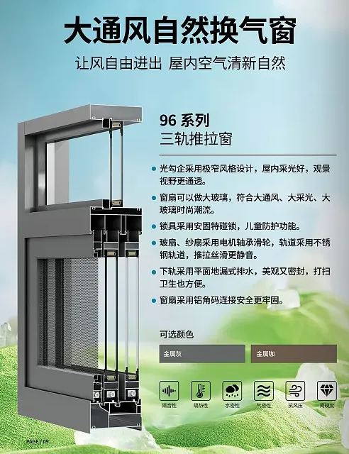 公司成立至今,以其卓越的产品品质、精湛的制作工艺以及欧美流行的设计风格赢得了消费者的认可与信赖,并一举成为门窗行业的新典范。产品全面运用先进生产技术,不断变革创新,力求产品完善。产品可提供多种颇色、材质的选择,表面处理采用国际先进的睛涂技术,着重体现客户的时尚品位,产品精选环保节能型材经过多个工序特殊处理和严格检测。确保其气离性、水密性、隔音、隔热,保温防潮防腐、抗风压以及防止环境污染等方面达到最佳效果,同时采用国内外最高端配件,使门窗系统滑动流畅,无噪音,使用寿命长,安全系高。