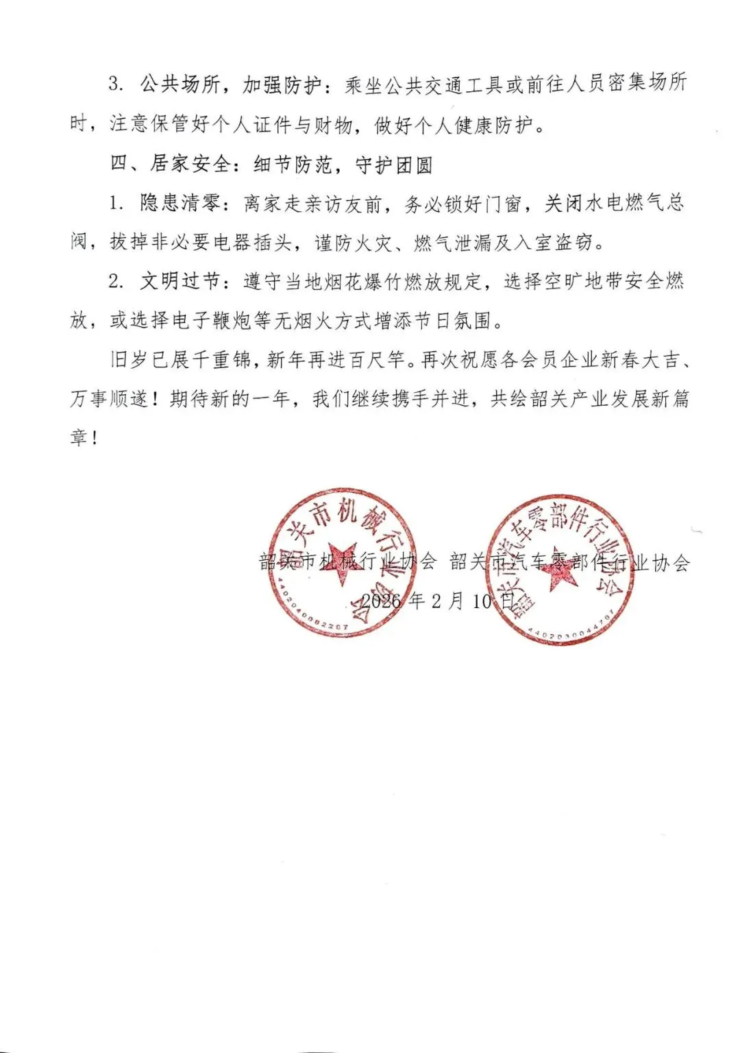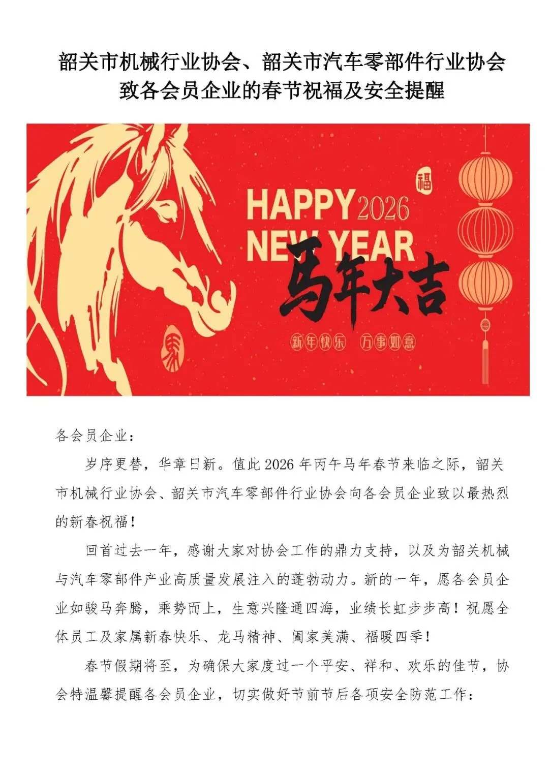 韶关市机械行业协会、韶关市汽车零部件行业协会致各会员企业的春节祝福及安全提醒