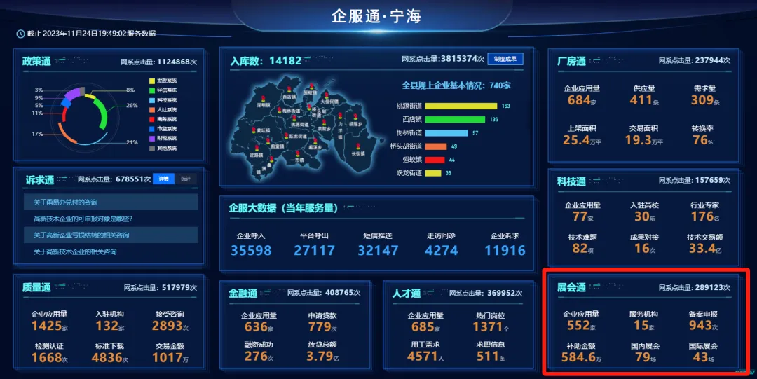 2023年度,展会通平台共整合各类优质展会服务商15家,发布国内外展会122场,累计参会企业达552家,备案参展信息943条,涉及展会补助584.6万元,平台点击量突破28.9万次。此外,展会通于2021年荣获第二届浙江省企业码场景应用创新大赛二等奖。