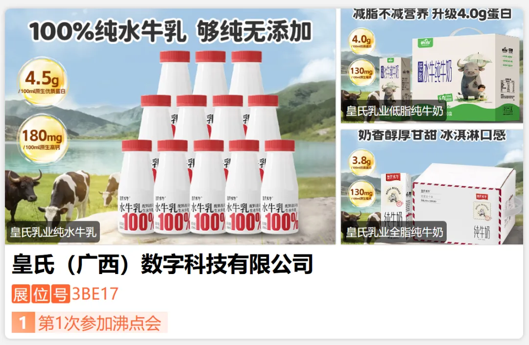 皇氏集团成立于2001年,2010 年于深交所上市,是国内A股第四家上市乳品企业,也是国内水牛奶产业龙头。拥有 28 个标准化自营牧场、7个现代化加工厂,各类乳制品年产能力近90万吨以上,承包了广西80% 的可控奶源。荣获“全国优秀乳品加工企业”、“国家重点龙头企业”“水牛奶、水牛乳制品销量TOP”等奖项,是广西家喻户晓的本土品牌。-展位号:3BD05-