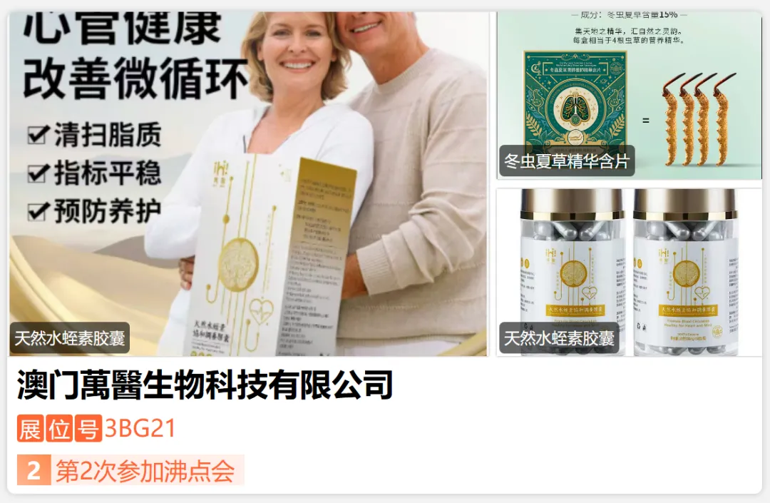澳门万医生物科技有限公司深耕健康领域,以"融汇传统医学与现代科技"为核心理念。其依托行业"三无一全"标准的水蛭索源头养殖场,结合破壁、低温萃取等技术,精准提炼自然精华。核心产品"天然水蛭素协和调养胶囊""冬虫夏草润肺养肺精华含片"从原料甄选到保税直发,全程严格品控,凭借澳门高品质汉方制造工艺,为消费者提供健康守护。-展位号:3BY15-