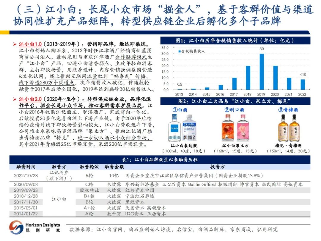 (3)江小白:小酒声量品牌,早年OEM起家主打年轻人的饮酒生意,善于文化营销,数轮融资后完成现代化供应链企业转型、孵化品牌,2019年巅峰时期全国营收约30亿。