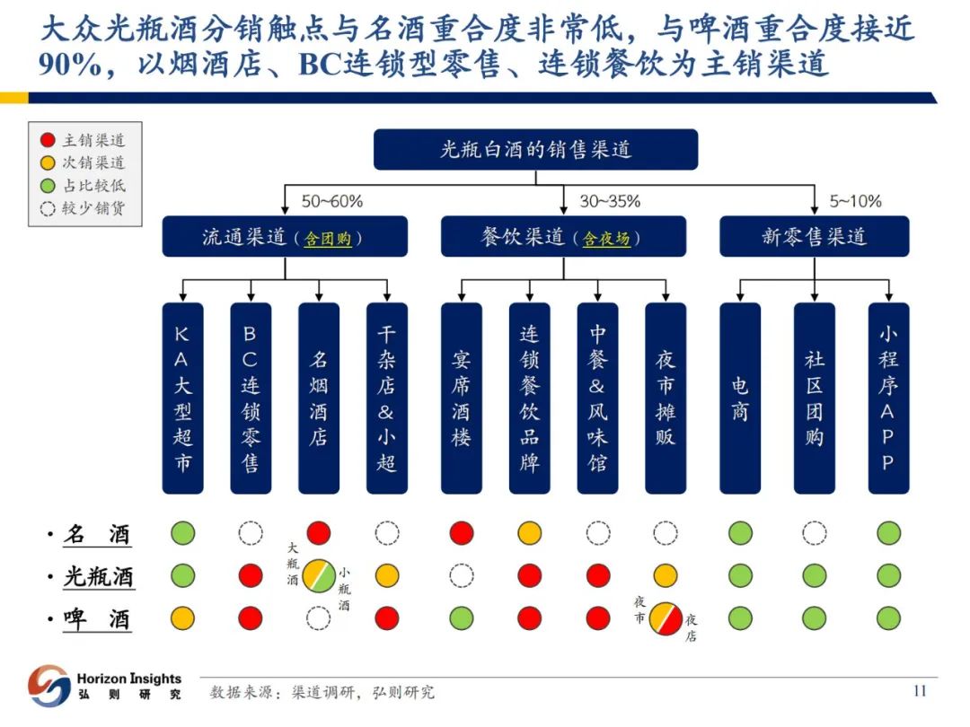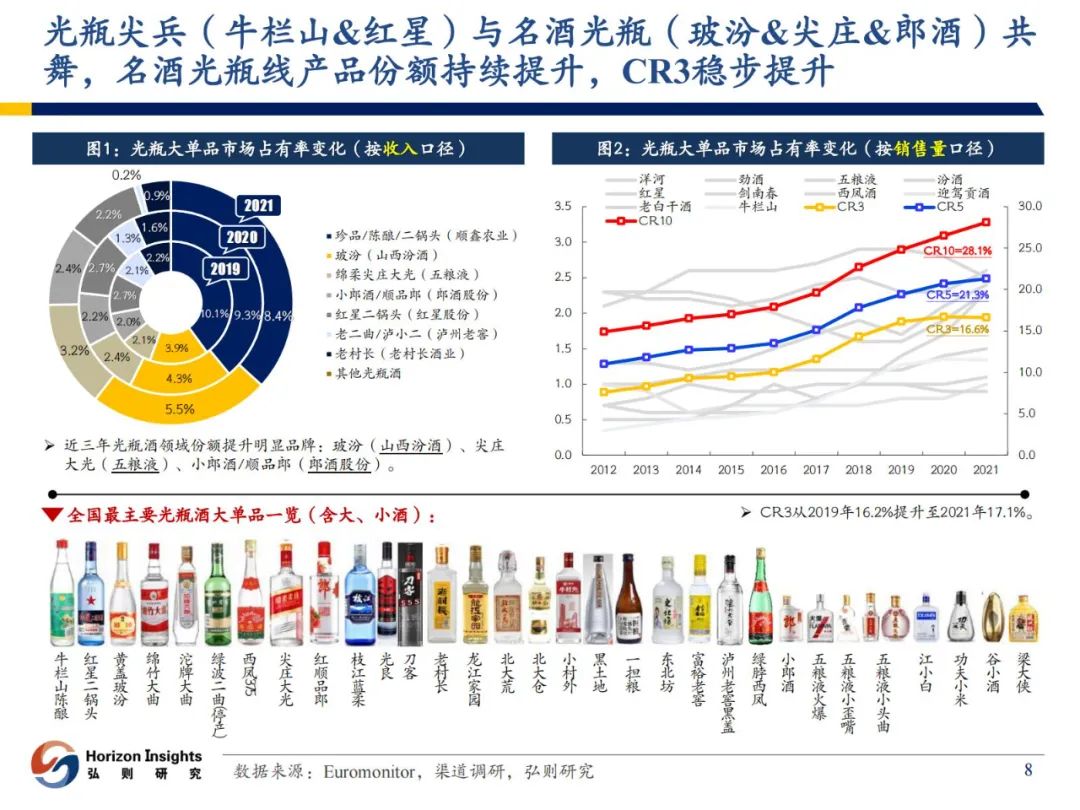 (3)格局分散:大单品突围赛,名酒/地产光瓶/光瓶尖兵三方势力角逐,白牛二、玻汾成为国民心中两款性价比之最的“锚产品”;