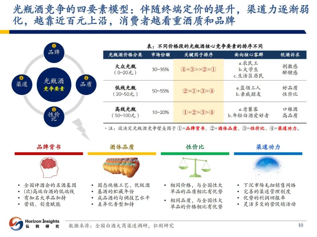 (4)竞争聚焦:基于“品牌/品质/渠道/性价比”四要素模型,大众/低线/高线光瓶酒在市场竞争的核心要素排序上存在差异。