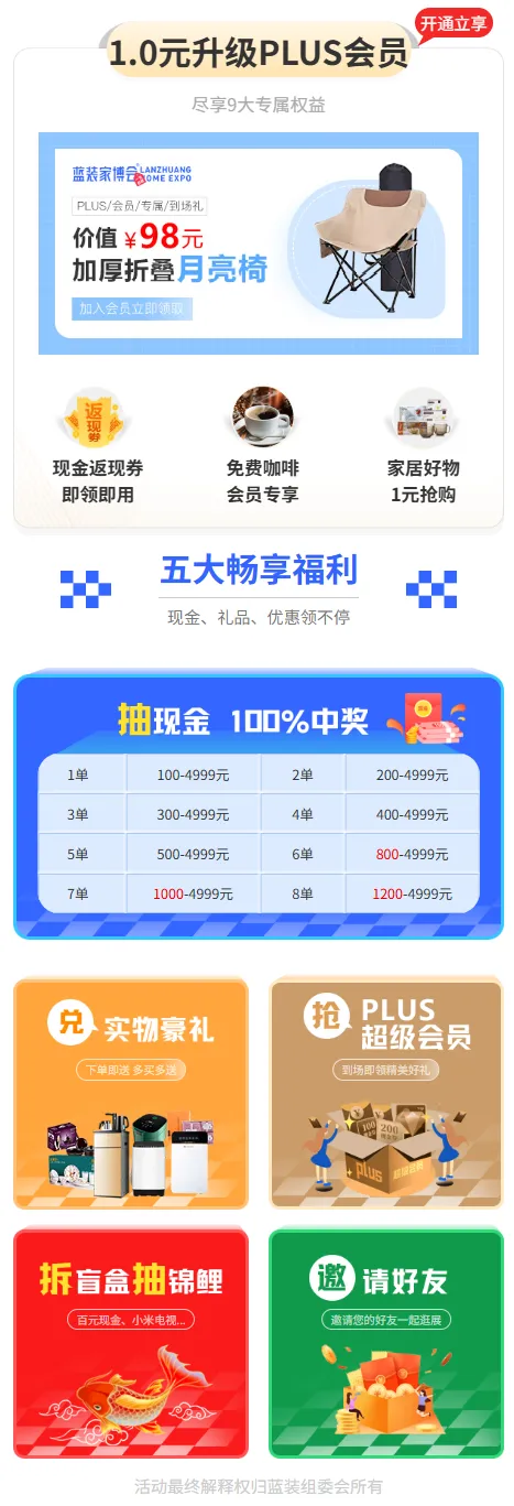 拆盲盒抽锦鲤:手持《蓝装家博会专用订单》,就能拆盲盒,有机会成为锦鲤,赢取现金或好物件。