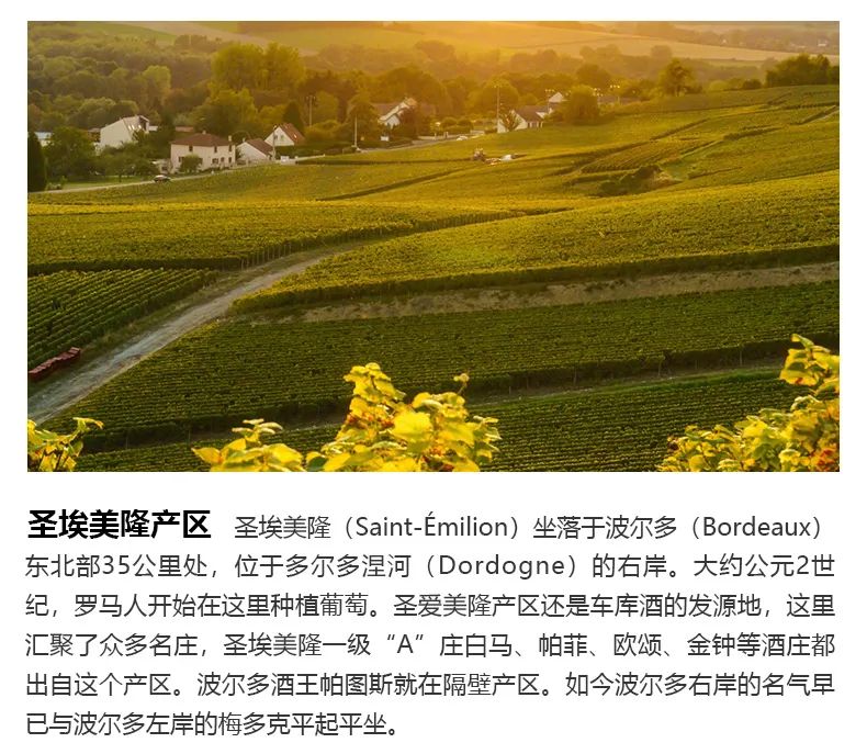 圣埃美隆(Saint-Émilion)位于多尔多涅河(Dordogne)的右岸。圣爱美隆产区还是车库酒的发源地,这里汇聚了众多世界名庄,圣埃美隆一级“A”庄白马、帕菲、欧颂、金钟等顶级酒庄都出自这个产区。如今波尔多右岸的名气早已与波尔多左岸的梅多克平起平坐。圣埃美隆也是世界上第一个被联合国教科文组织评为“世界文化遗产”的葡萄酒产区。这个评定肯定了这里特殊的葡萄种植风土条件,葡萄园呈阶梯状分布,被誉为“千座酒庄的山丘”。