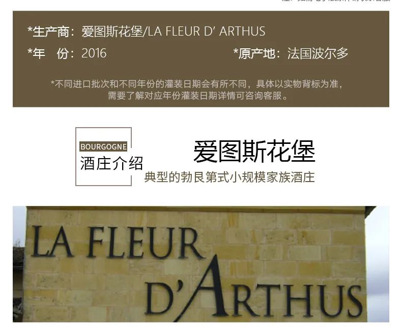 爱图斯花堡(La Fleur d’ Arthus)是波尔多一家典型的勃艮第式小规模家族酒庄,萨尔维夫妇(Myriam et Jean-Denis Salvert)自30年前接手酒庄以来一直致力于葡萄园科学种植和葡萄精酿研究。葡萄园紧邻圣埃美隆一级“A”庄-帕菲酒庄(Château Pavie)。葡萄园地势独特,光照充足,土壤中含有丰富的硅类矿物质,是周围先天最好的一块土地。酒庄每年的细致呵护,始终以大自然为本,种植出高品质的葡萄。爱图斯花堡以温柔的梅洛为主要品种,再加入30%的品丽珠。