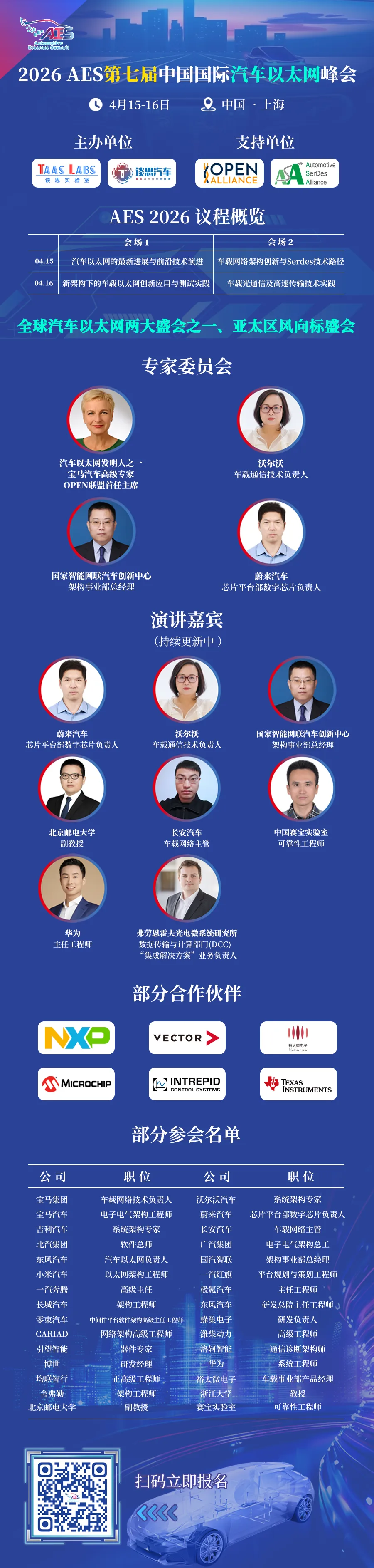 更多TSN技术及其车载应用实践,欢迎报名AES 2026 第七届中国国际汽车以太网峰会↓