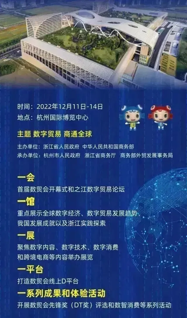 此外,本届数贸会还将举办之江数字贸易论坛主论坛、DEPA与数字经济合作高峰论坛、世界直播电商大会等一系列高层次论坛会议,开展全球数字贸易博览会先锋奖(DT奖)活动,并发布“2022全球数字贸易行业企业Top100评选”、《2022数字贸易企业百强榜》、《中国数字贸易发展报告(2021)》等一批重磅成果。