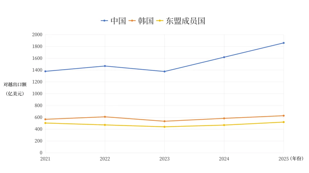 出口市场:越南海关总署数据显示,2025年中国仍为越南最大供应国,进口额达1860亿美元,占比高达40%。中国、韩国、东盟成员国为越南前三大进口国,合计占比超60%(中国企业主要提供机械设备、电子零部件、钢铁、塑料原料及纺织服装原材料等生产资料),对区域贸易政策变化敏感度较高。