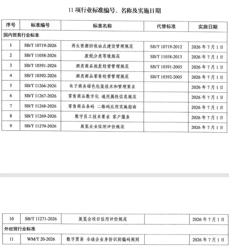近日,商务部发布2026年第5号公告,批准发布11项国内贸易行业标准。由商务部流通产业促进中心、重庆国际博览中心有限公司共同起草的《展览企业信用评价规范》(SB/T 11270-2026)、《展览会项目信用评价规范》(SB/T 11271-2026),经商务部审核并公布,将于2026年7月1日正式实施。上述两项标准标准的技术归口单位由展览业行业标准化技术委员会(SW/TC 3)负责。