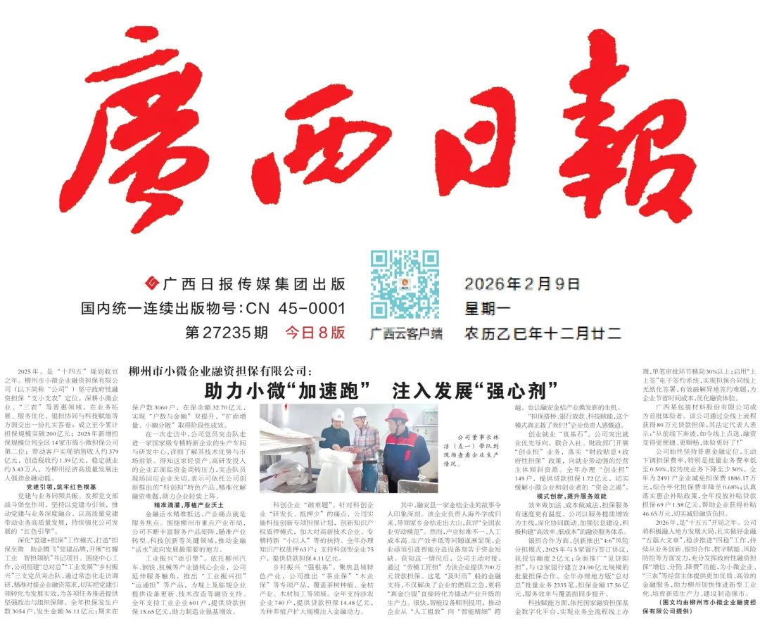 2月9日,广西日报刊登《柳州市小微企业融资担保有限公司:助力小微“加速跑” 注入发展“强心剂”》一文,全文如下: