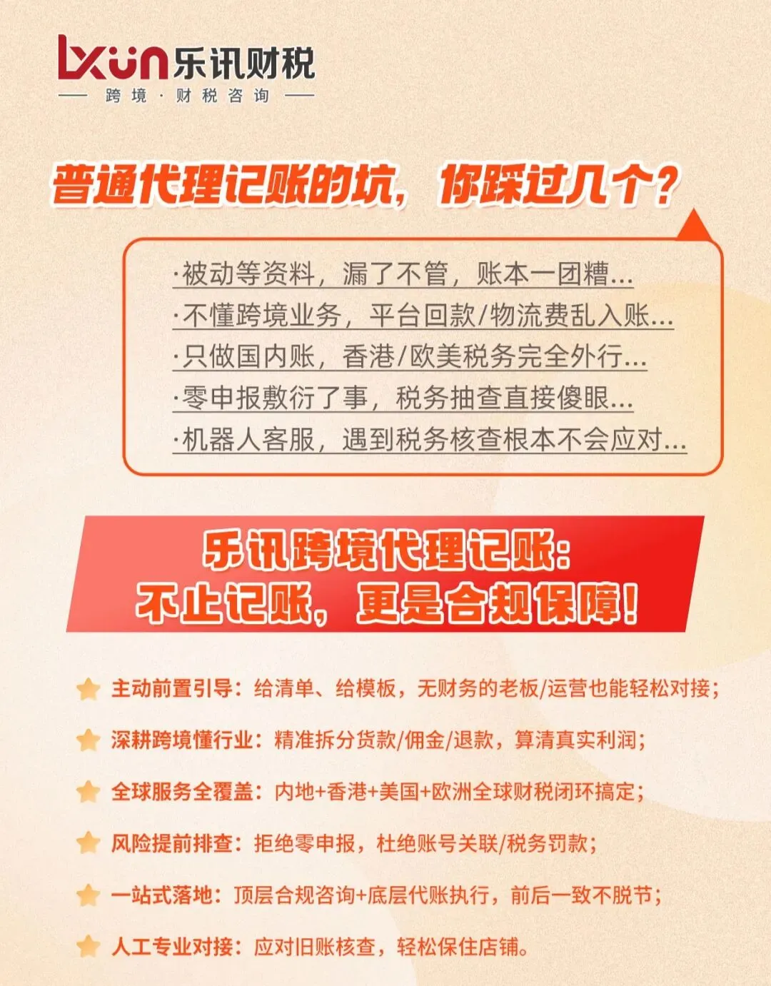 普通代账帮你“应付报税”,乐讯跨境代账帮你“合规风控”;