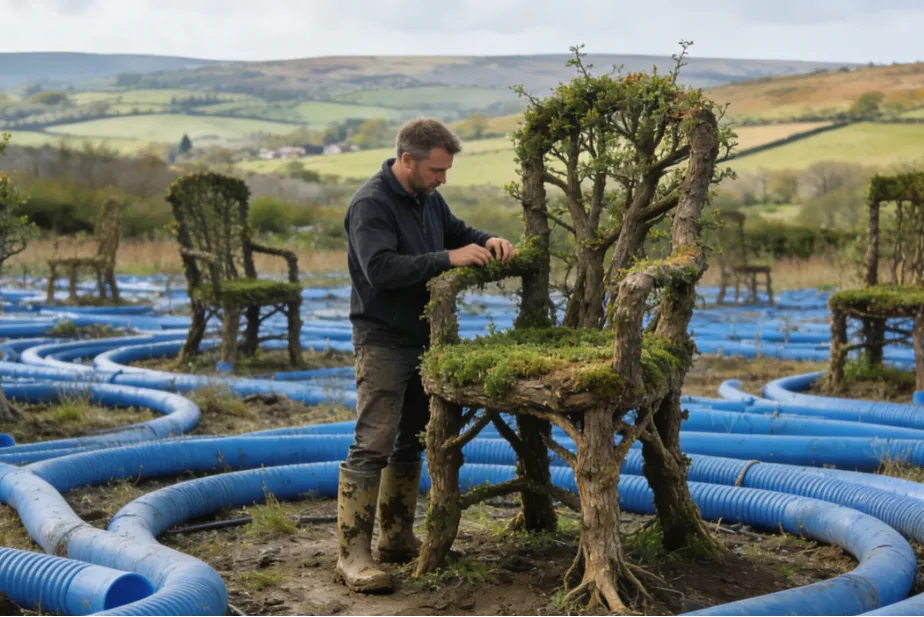 英国德比郡的一片荒野里,2.5英亩的土地上插满了蓝色的塑料管子。这里没有电锯的尖叫,没有传送带的摩擦声,只有风吹过叶子的噪音。Gavin Munro 穿着沾满泥浆的雨靴,正在检查第 4 排的“半成品”。