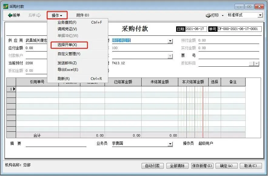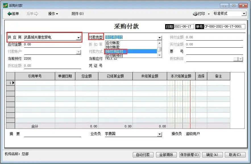 选择供应商,付款类型:预付冲应付