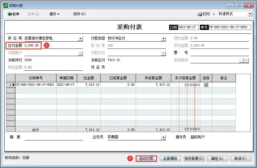 我们本次准备冲销2200,那么应付金额为2200,然后点击自动付款,确认无误后点击保存新增或确定。