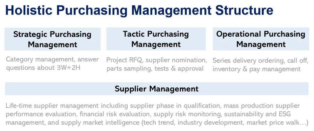全面采购管理的框架一般分为三大部分: 战略采购,战术采购,运营采购。 战略采购在很多公司也叫品类采购,不仅是执行“买什么怎么买”这样的任务,它承担着构建企业未来供应链布局的重要使命,通过需求分析、市场洞察、品类定位及供应商战略,清晰地回答3W+2H的问题: 什么时间(when)在哪里(where),需要什么样的供应商(what ),及需要多少供应商(how many)和如何实现(how),以此形成采购的方向感和节奏感。这些战略上的前置判断,将决定我们未来三到五年的供应商结构、合作方式和深度,供应链的成本结构、抗风险能力以及供应安全。