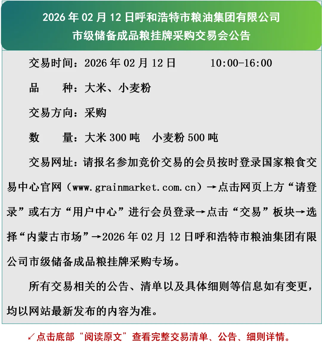 2026年02月12日呼和浩特市粮油集团有限公司市级储备成品粮挂牌采购公告