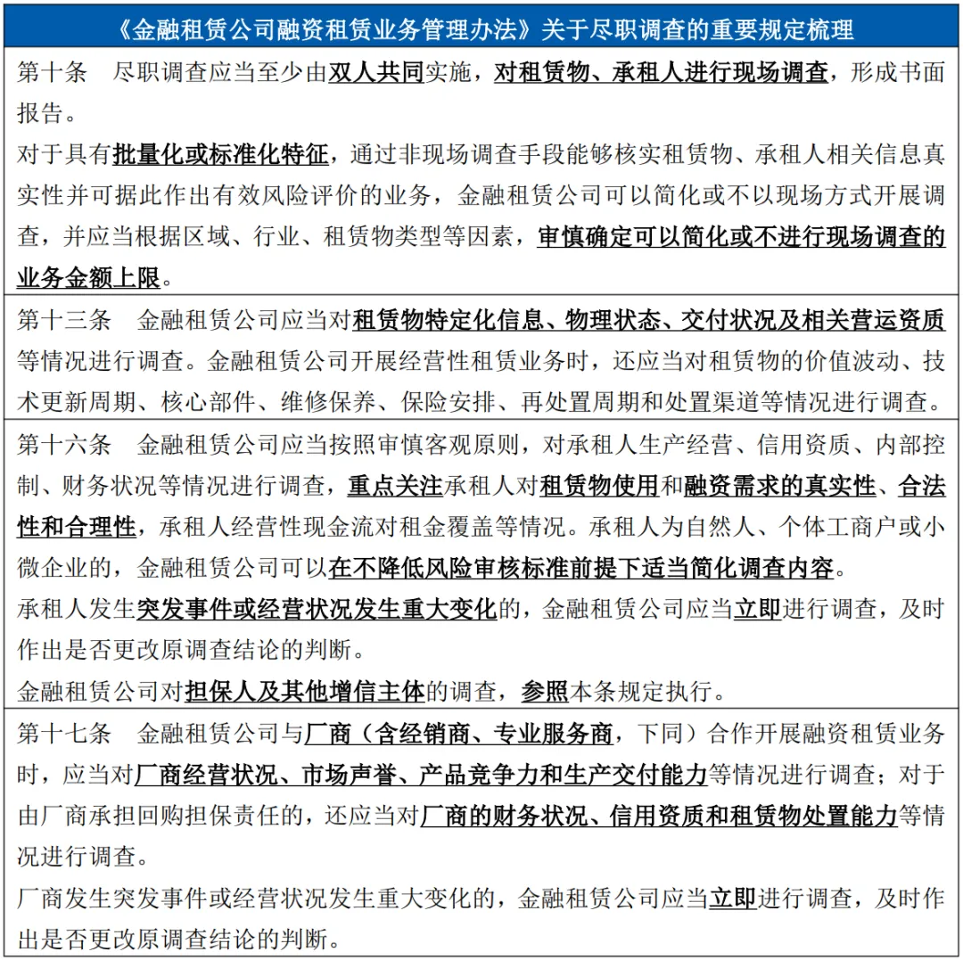 《办法》第二章详细规定了金融租赁公司开展融资租赁业务的尽职调查要求。对于金融租赁公司日常业务的开展可能影响较大的要求包括: