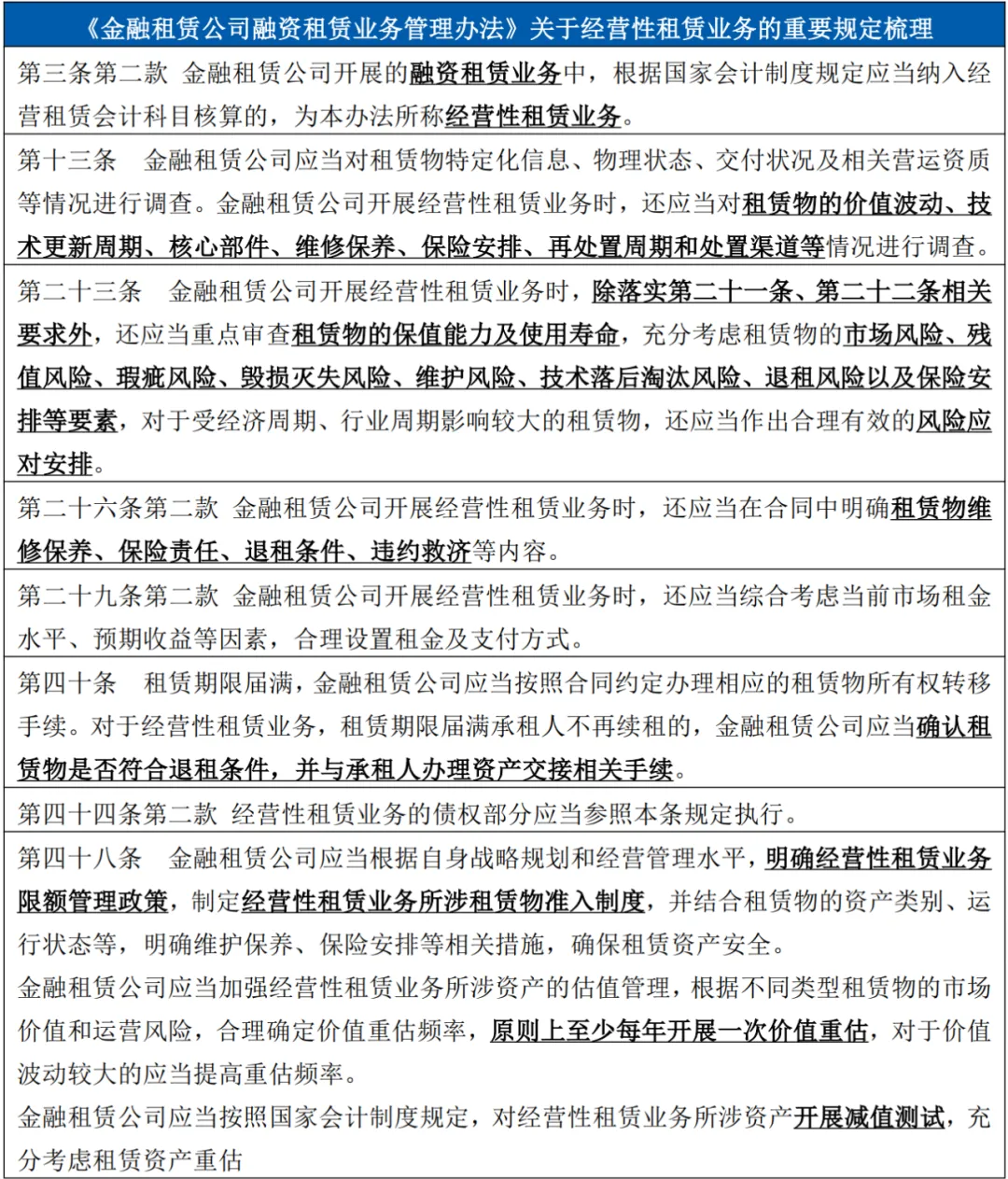 值得注意的是,《办法》对金融租赁公司开展经营性租赁业务时,租赁物的尽职调查内容、租赁物的保值能力及使用寿命、承租人退租的资产交接、定期价值重估、减值测试、资产风险分类等均作出了细化规定。建议金融租赁公司尽快比照《办法》的规定,调整、细化经营性租赁业务的内部管理规定。
