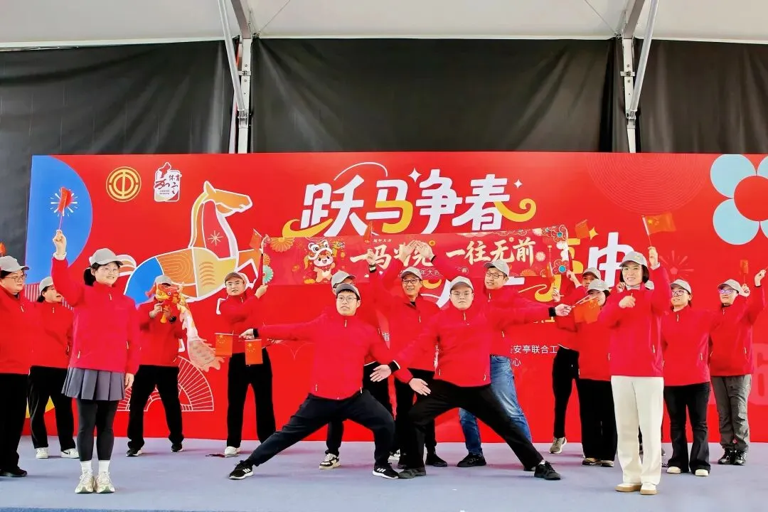 在激昂的旋律中,来自安亭镇的14支机关职工运动员队伍精神抖擞,依次步入会场。他们有的手持小红旗,在冬日暖阳下舞出蓬勃朝气;有的身着小马服,踏着动感节拍舞动青春;还有的手捧福袋与金元宝,蹦蹦跳跳间洒出象征吉祥的金币巧克力,寓意新年福运满满。各队表演创意十足、特色鲜明,现场欢呼阵阵,喜庆热闹的氛围瞬间点燃。