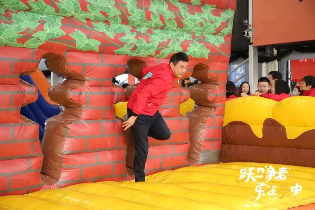此次运动会设置了“勇攀高峰”“马上有钱”“投球迎福”等六个趣味项目。赛场气氛热烈,欢笑不断。在“勇攀高峰”项目中,队员们穿梭于巨大的充气城堡,灵巧地挤过狭窄的“树”型障碍门,迅速钻过低矮的“西瓜田”,奋力攀上顶峰完成接力,身手矫健,引来阵阵加油喝彩。其他赛场同样精彩纷呈:精准的投篮、飞转的呼啦圈、轻快的跳绳、飞舞的毽子…… 大家在各个项目中默契配合、协力拼搏,尽情享受着运动的乐趣,充分展现了团队的凝聚力与蓬勃朝气。