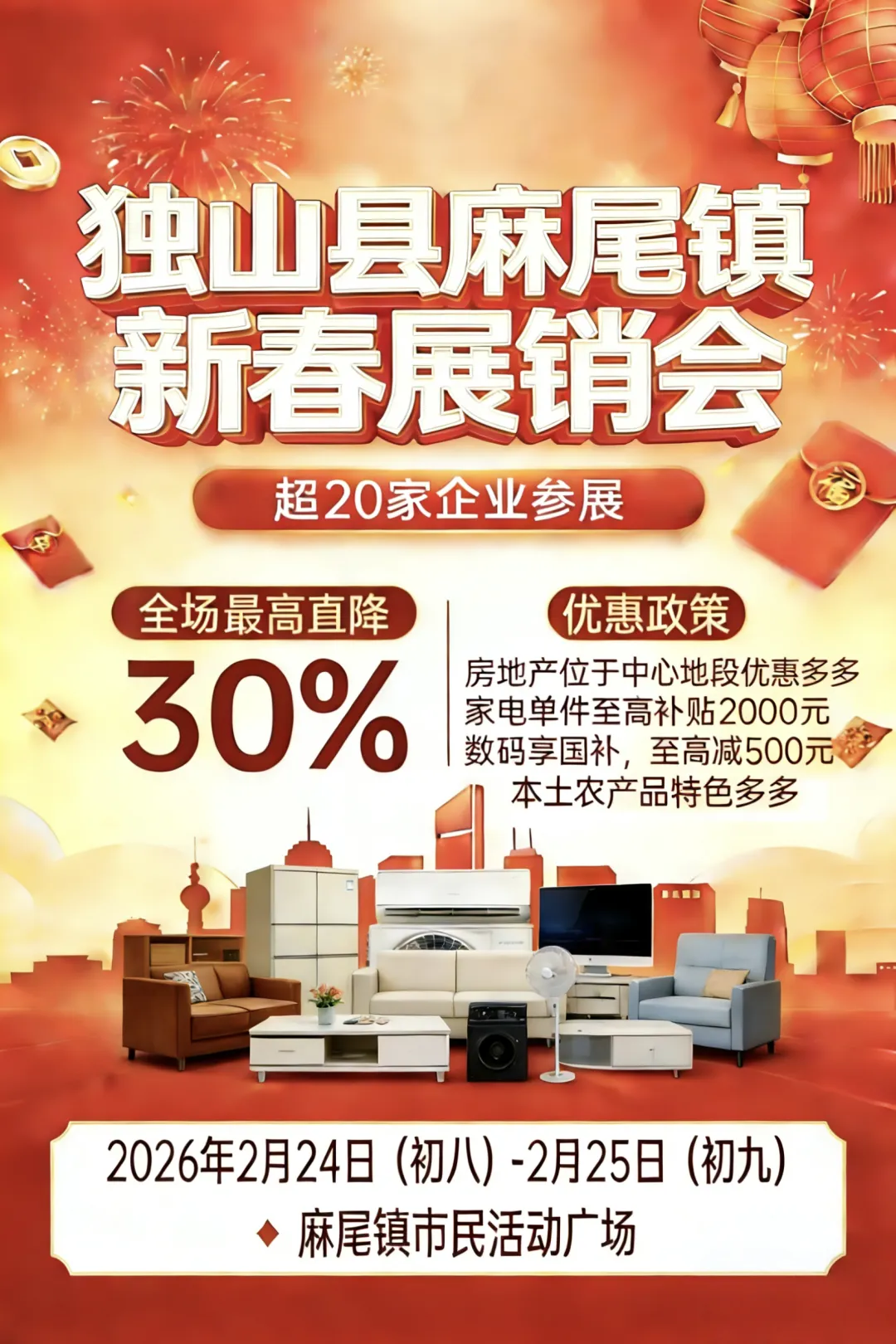 年味渐浓,好礼将至!为丰富麻尾镇群众新春生活,助力乡村消费提质,2026年独山县麻尾镇新春展销会即将火热开启,超20家企业齐聚!
