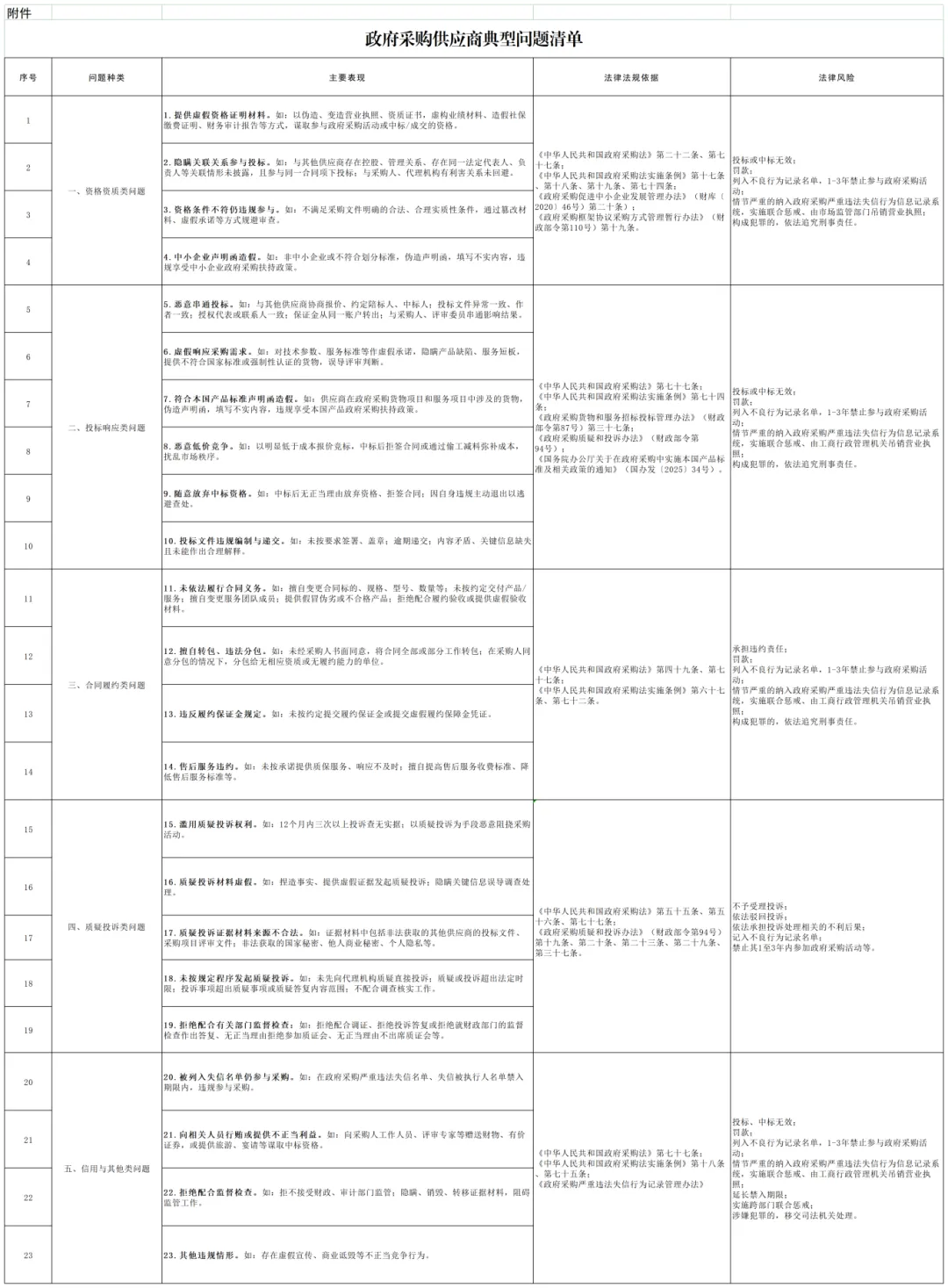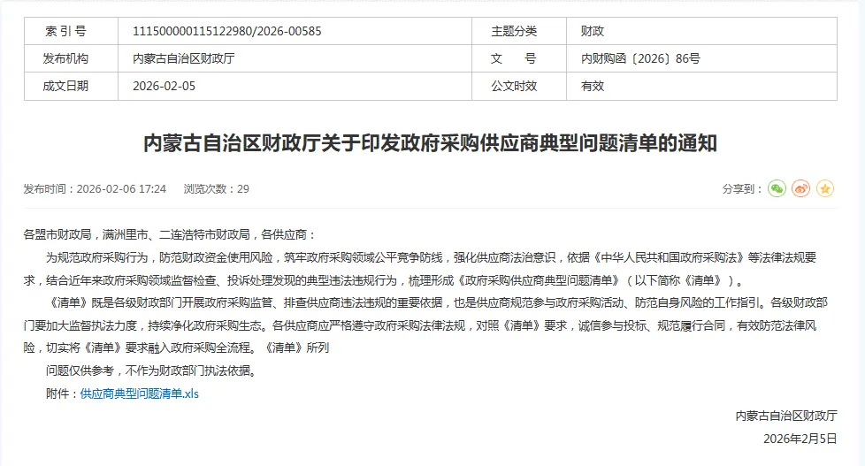 为规范政府采购行为,防范财政资金使用风险,筑牢政府采购领域公平竞争防线,强化供应商法治意识,依据《中华人民共和国政府采购法》等法律法规要求,结合近年来政府采购领域监督检查、投诉处理发现的典型违法违规行为,梳理形成《政府采购供应商典型问题清单》(以下简称《清单》)。