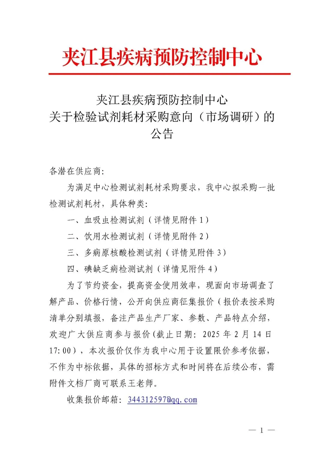 夹江县疾病预防控制中心关于检验试剂耗材采购意向(市场调研)的公告