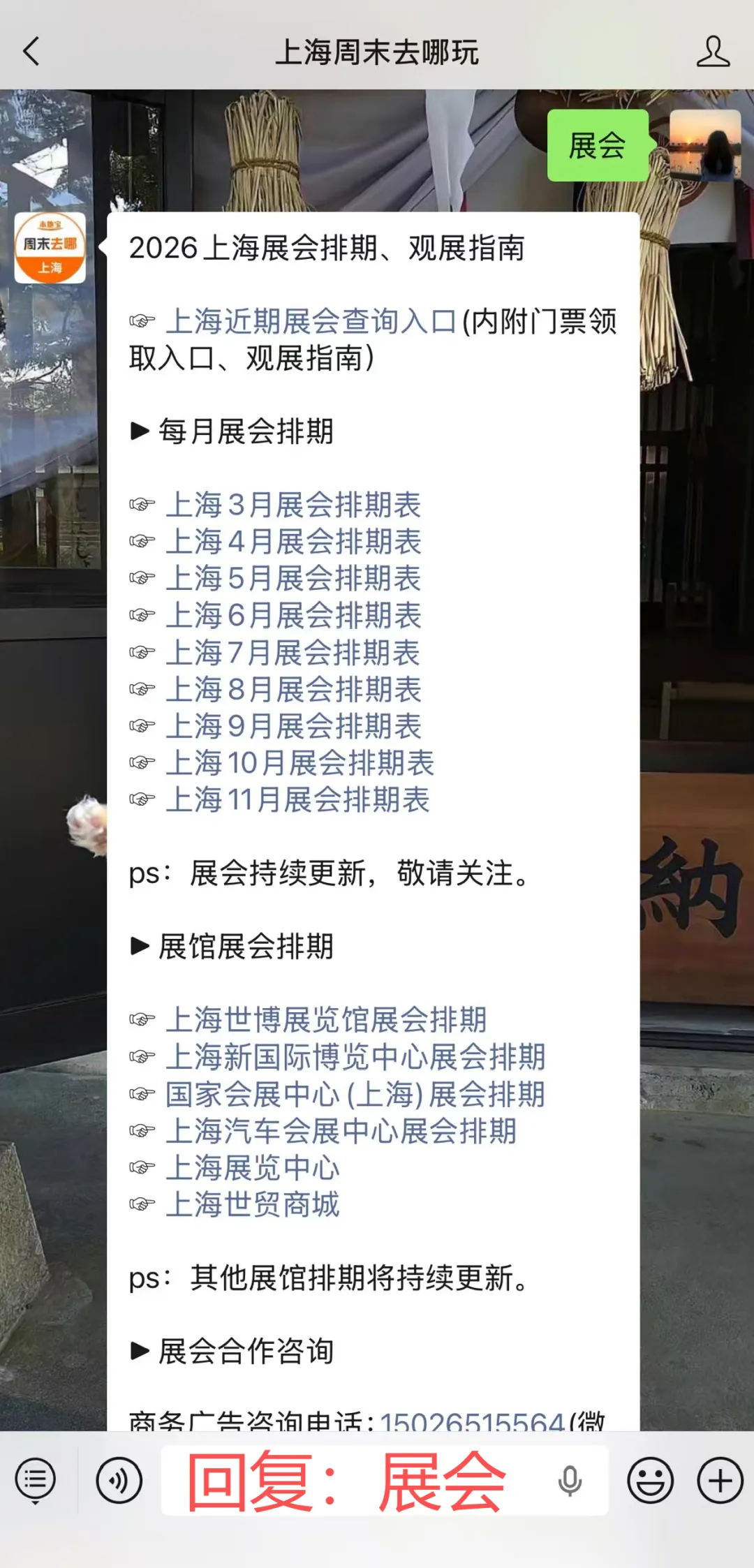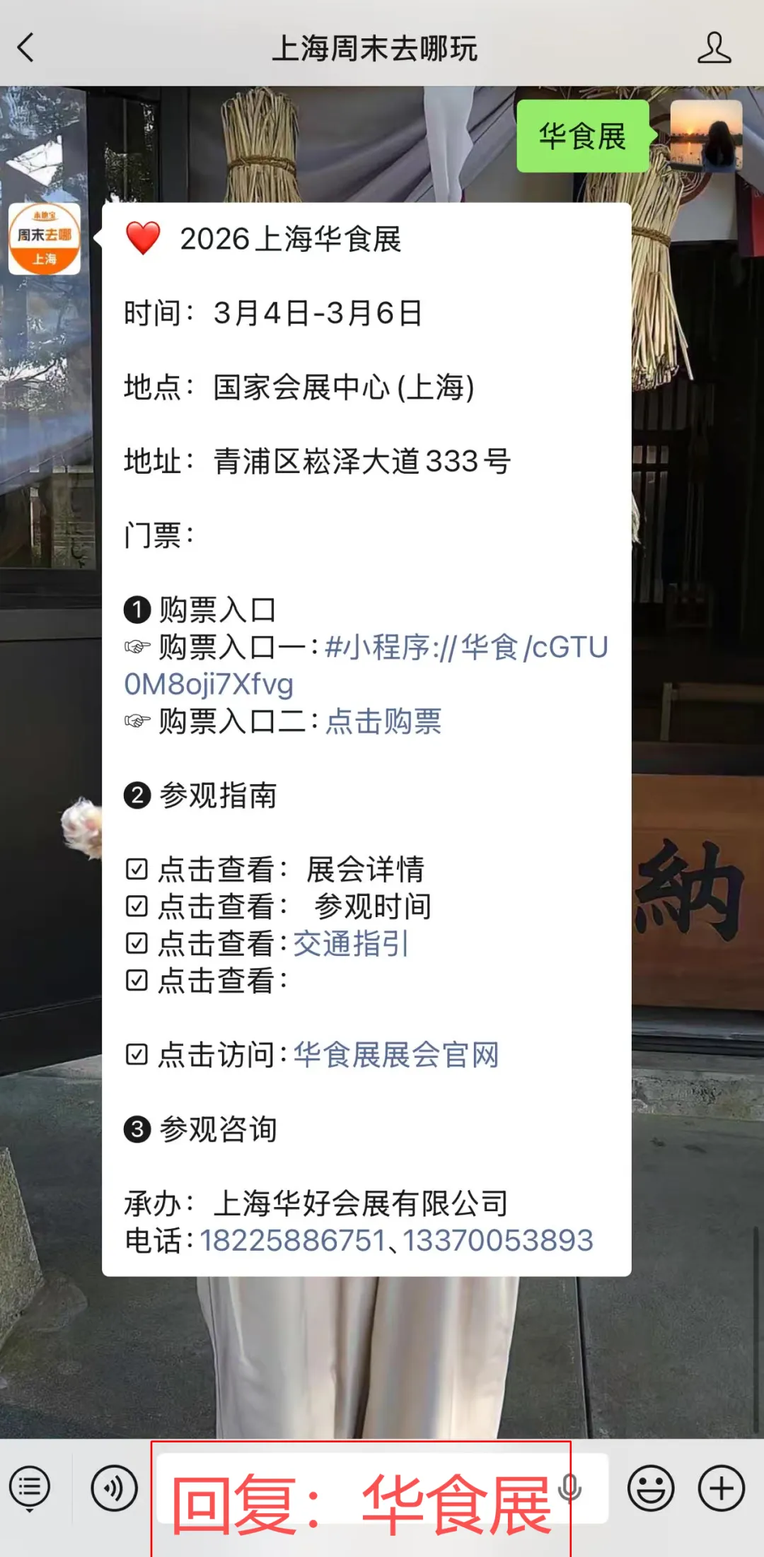 ✍推荐阅读:微信关注【上海周末去哪儿玩】微信公众号,聊天对话框发送关键词【华食展】获取预登记入口、参展攻略等内容。
