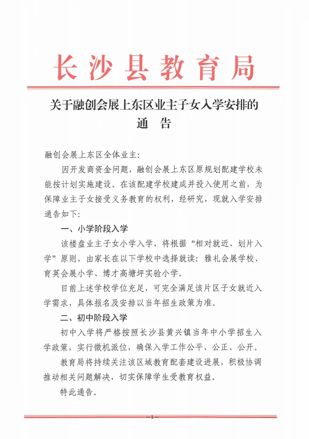 【长沙县教育局关于融创会展上东区业主子女人学安排的通告】