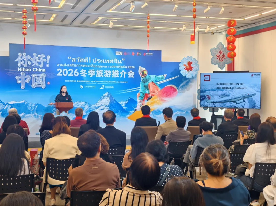2月6日,由中国驻曼谷旅游办事处和泰国出境旅游协会共同主办的“2026‘你好!中国’冬季旅游推介会”在泰国曼谷举行。泰国出境旅游协会会长查棱·旺阿纳侬、泰华旅游同业公会会长许荣坤、泰国旅游观光协会秘书长郑楚锦和中国驻曼谷旅游办事处负责人张若愚等嘉宾出席会议并剪彩,泰国旅行社代表、主流媒体及知名旅游博主参加活动。