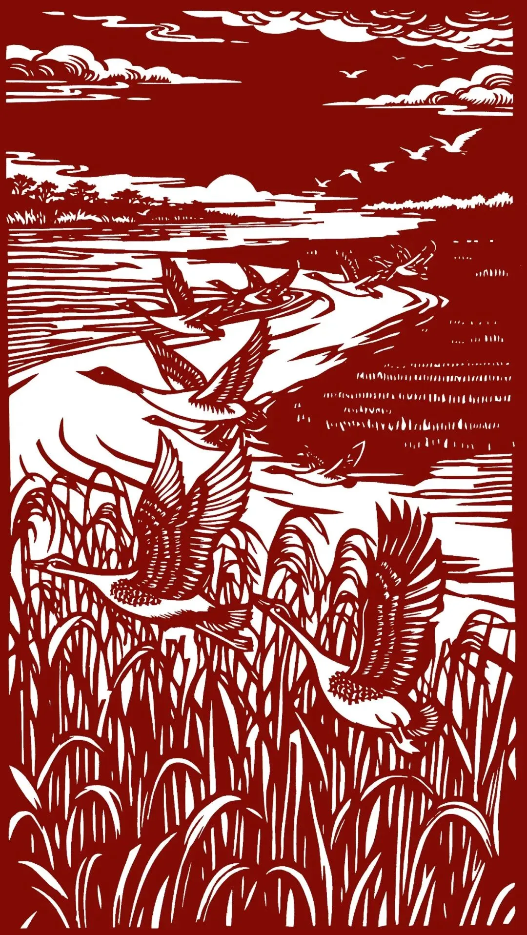 作品介绍:每年秋冬,东明黄河滩气候温润,数以十万计的大雁自北方成群而来,于此越冬。它们翩飞有序,或成“人”字,或排“一”字,景象尤为壮阔。《黄河归雁》描绘雁阵翱翔、芦苇摇曳之景,融“落霞与孤骛齐飞,秋水共长天一色”之意境,黄河浩荡、云霞绚烂。既展现自然之雄奇,又以雁归喻游子还乡,深蕴家国之思与对团圆奋进的殷切期盼。