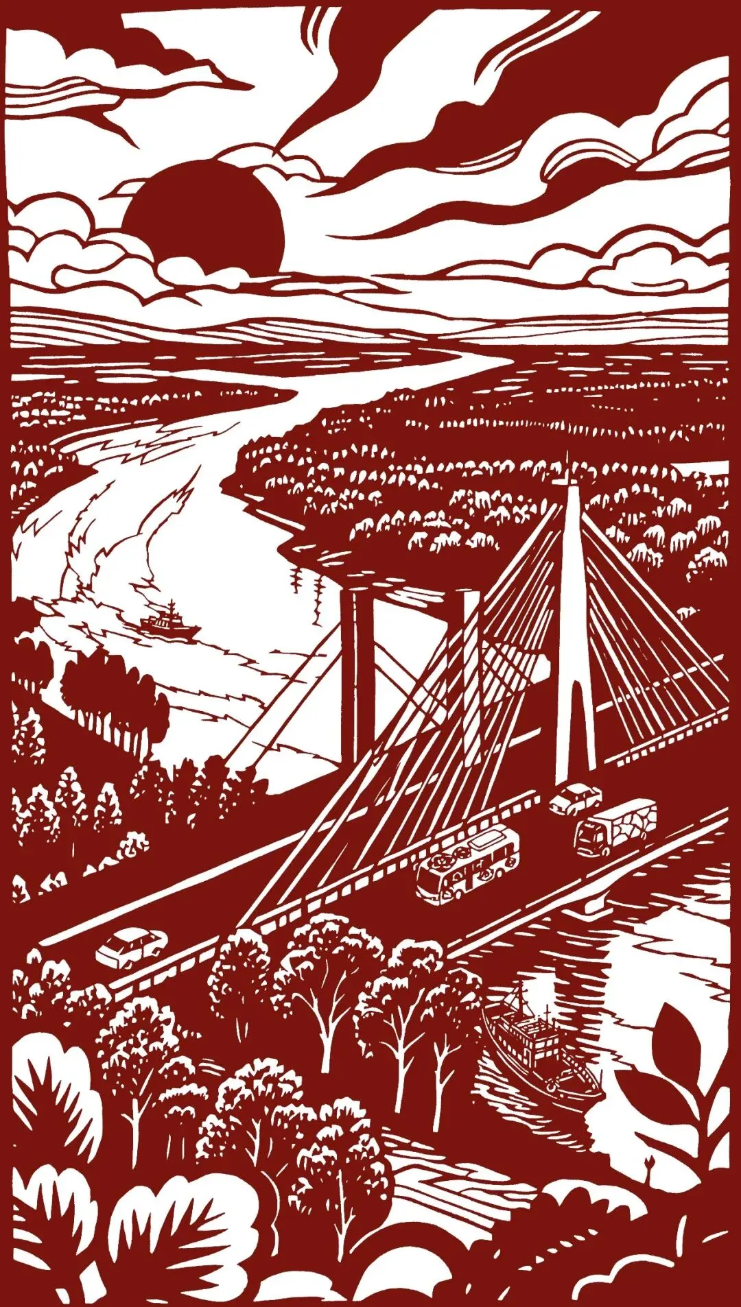 作品介绍:东明黄河公路大桥是山东省内跨度最长的公路桥,自1993年通车以来,始终是连接鲁豫的关键通道。2025年6月改扩建完成后,升级为双向六车道,显著提升通行能力。《桥联鲁豫》中以硬朗的线条突出大桥厚重稳健的体态,桥下黄河奔涌、两岸绿树葱茏,展现出一幅动静交融、生机盎然的画面。该桥不仅是交通动脉,更是推动黄河流域高质量发展、促进区域协同的重要纽带。