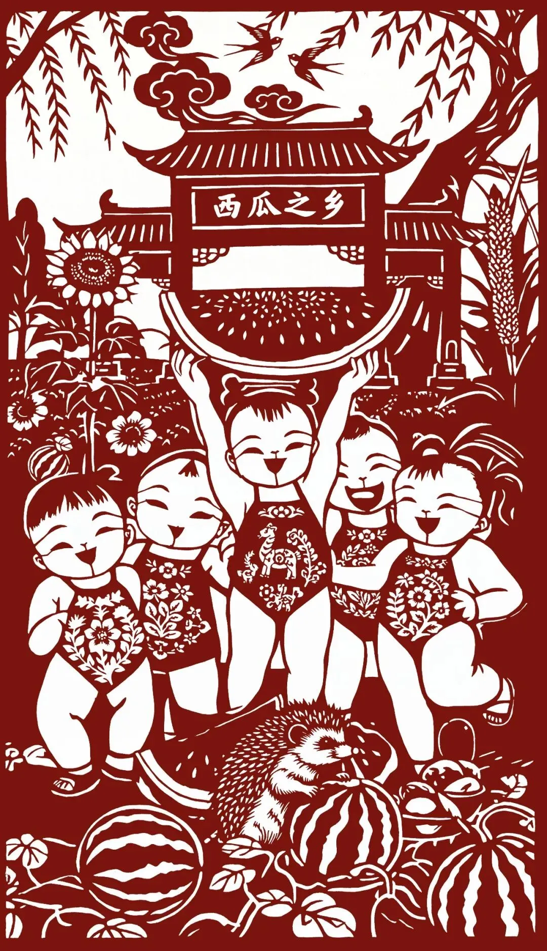 作品介绍:东明县是国务院首批命名的“中国西瓜之乡”。这里沙壤肥沃,引黄河水灌溉,昼夜温差大,孕育出皮薄瓤沙、甘甜多汁的东明西瓜,并荣获国家地理标志认证,品牌价值超32亿元。每年西瓜节汇聚非遗展演和文旅体验,带动产业与经济双丰收。《西瓜之乡》描绘了一群孩子在瓜田旁畅享红瓤西瓜的欢乐场景,笑容如身边向日葵般灿烂,燕子在晴空欢快飞舞,小刺猬也来凑热闹,生动传递出“中国西瓜之乡”的甜蜜与活力。