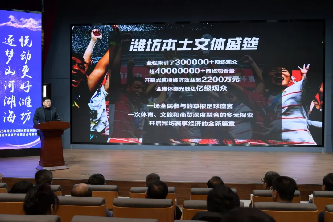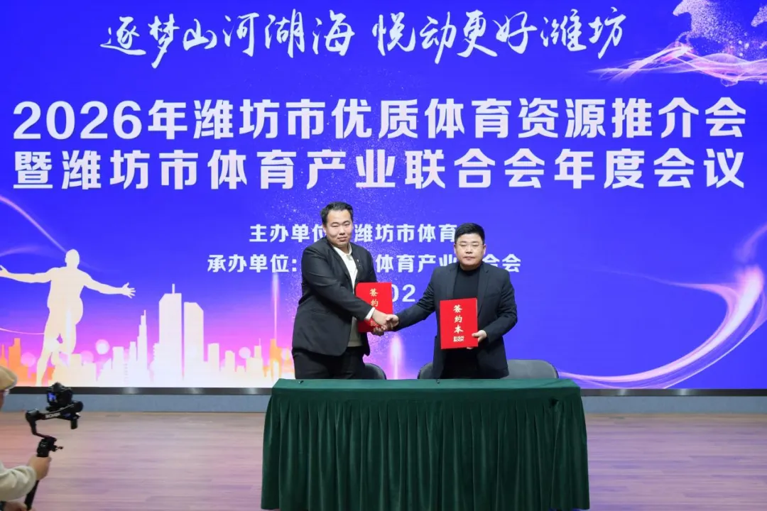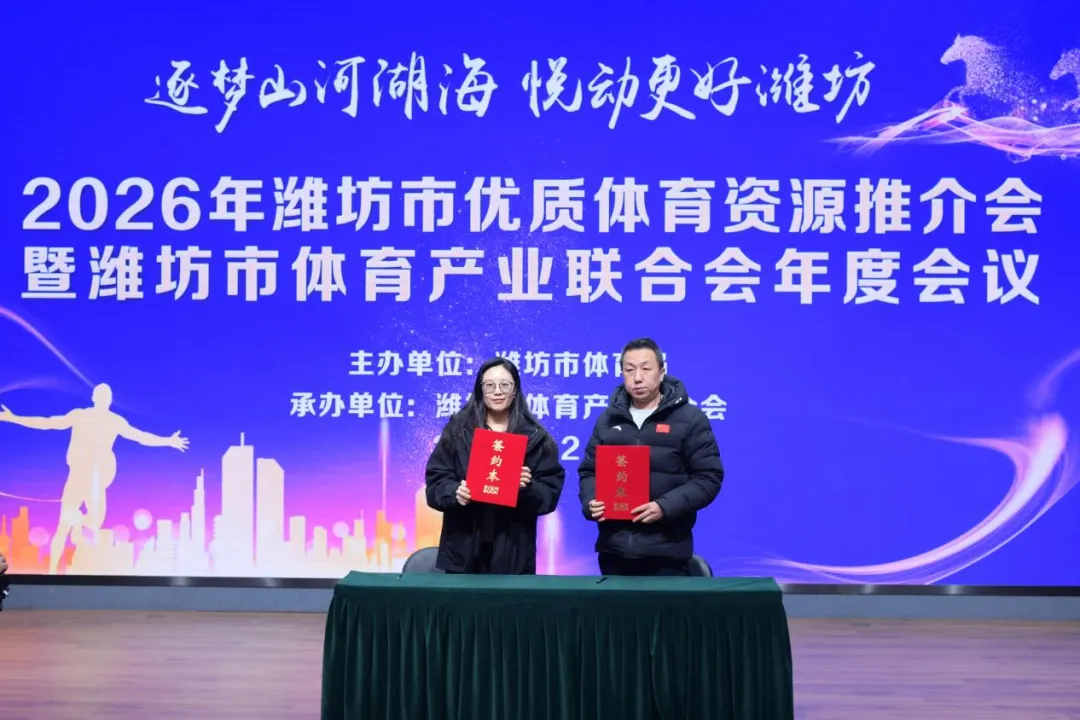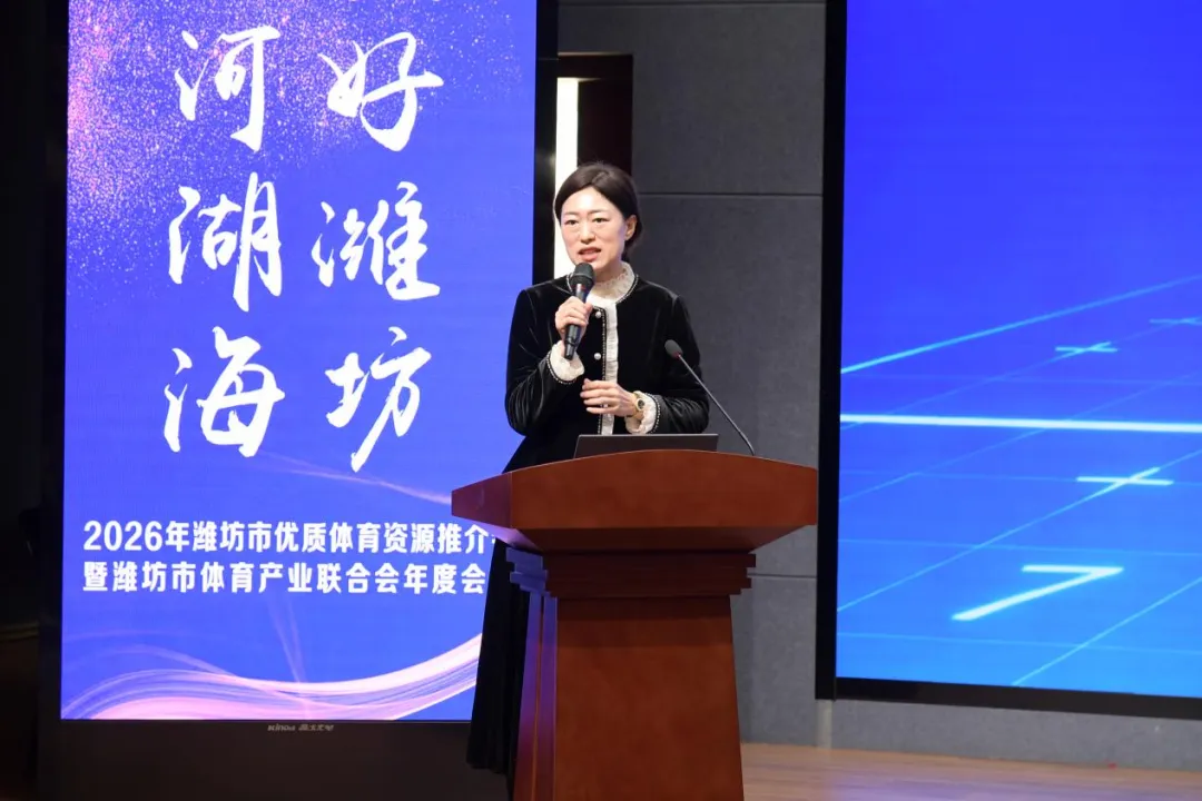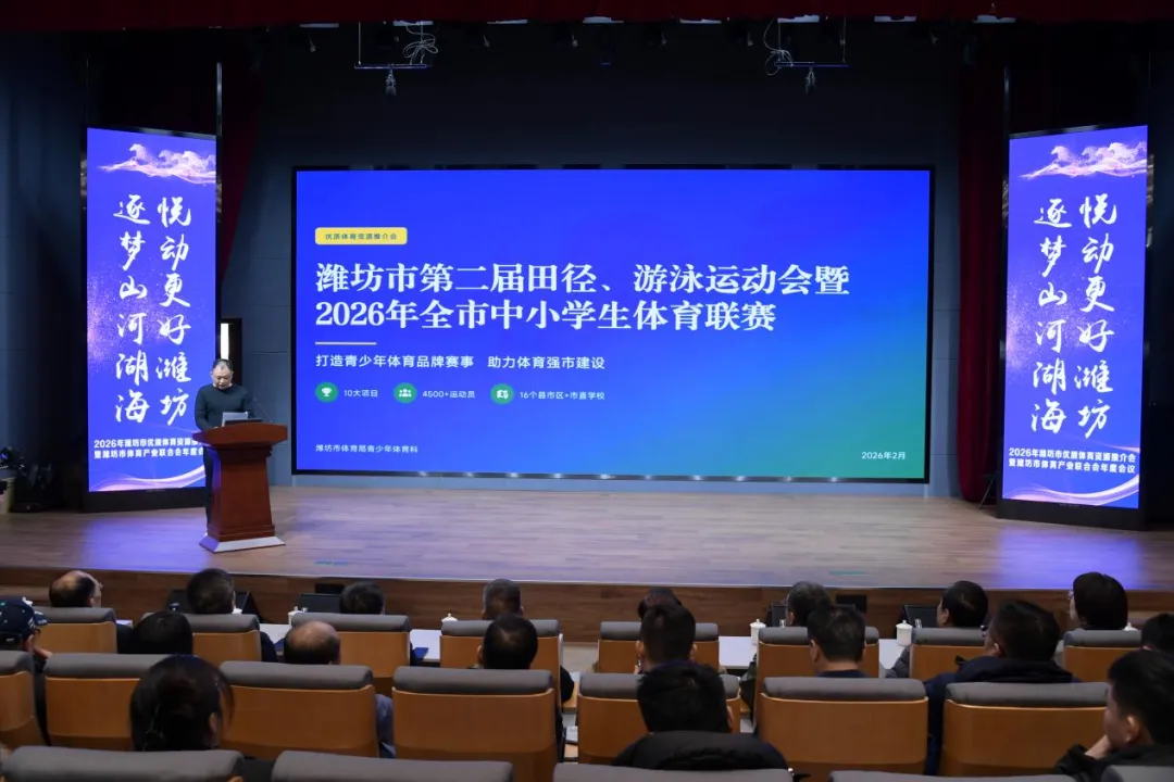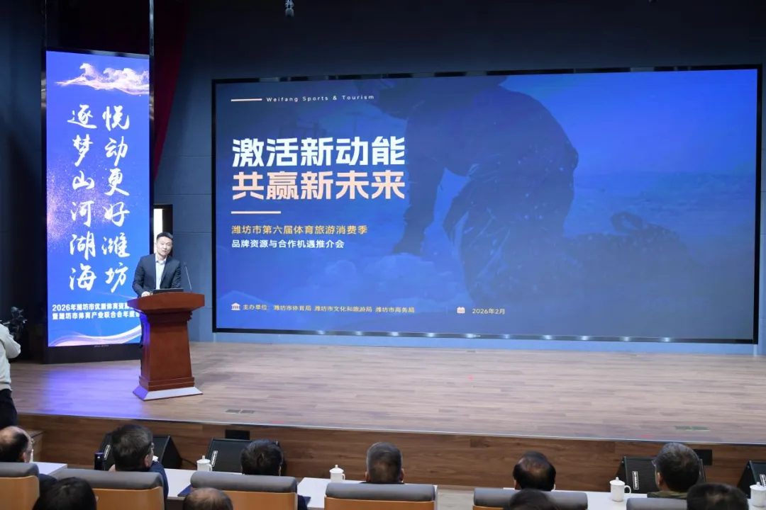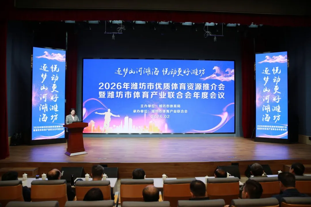 2月7日,由潍坊市体育局主办、潍坊市体育产业联合会承办、潍坊市融媒体中心协办的2026年潍坊市优质体育资源推介会暨潍坊市体育产业联合会年度会议在潍坊融媒体中心举行。市体育局产业科,各县市区教育和体育局、体育事业发展中心相关人员,市体育产业联合会会员单位代表共计120余人齐聚一堂,复盘成果、推介资源、共探机遇、签约合作,为潍坊体育产业高质量发展和体育强市建设凝聚新动能。