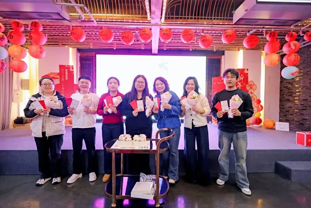 幸运抽奖落幕,温情仍在延续。恰逢新春喜乐之时,晚宴现场为当月过生日的7位同事举办了生日会,将个人欢喜与公司廿载荣光紧紧相连。
