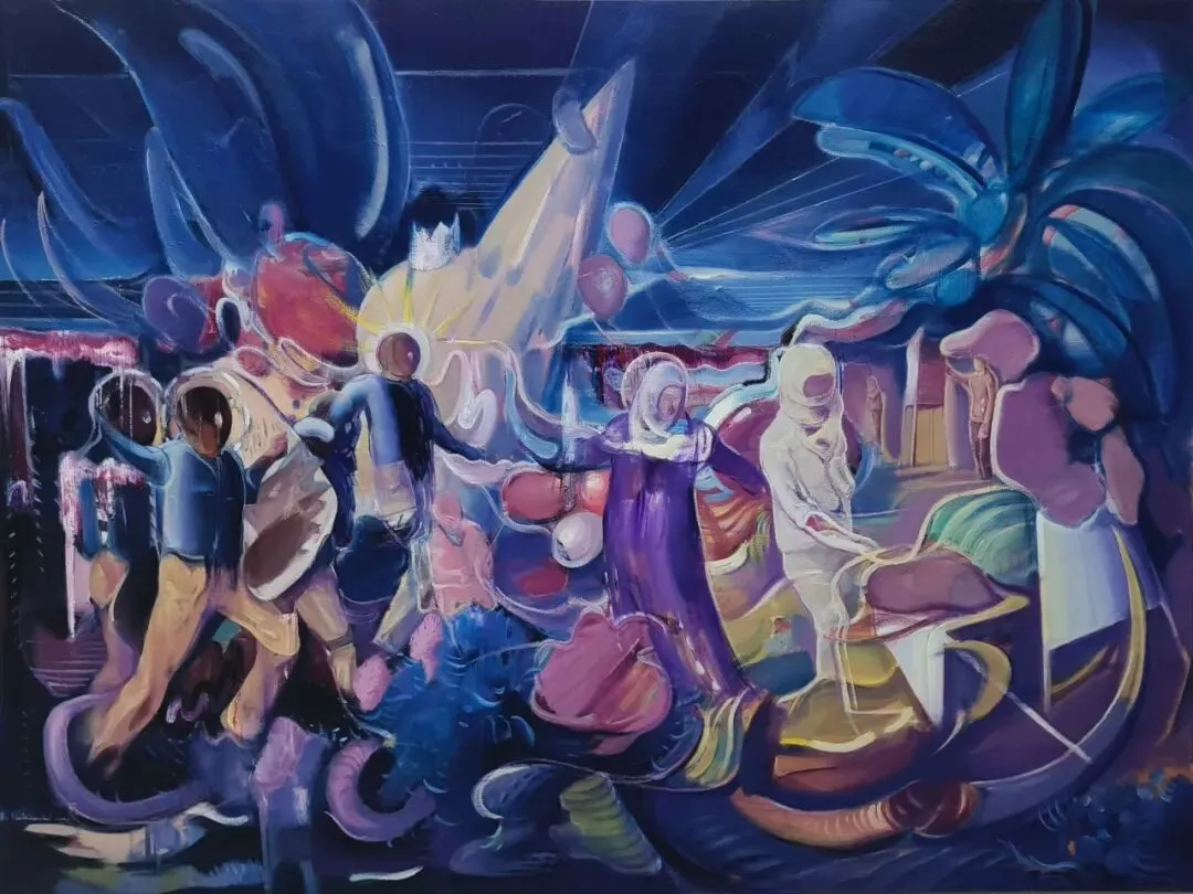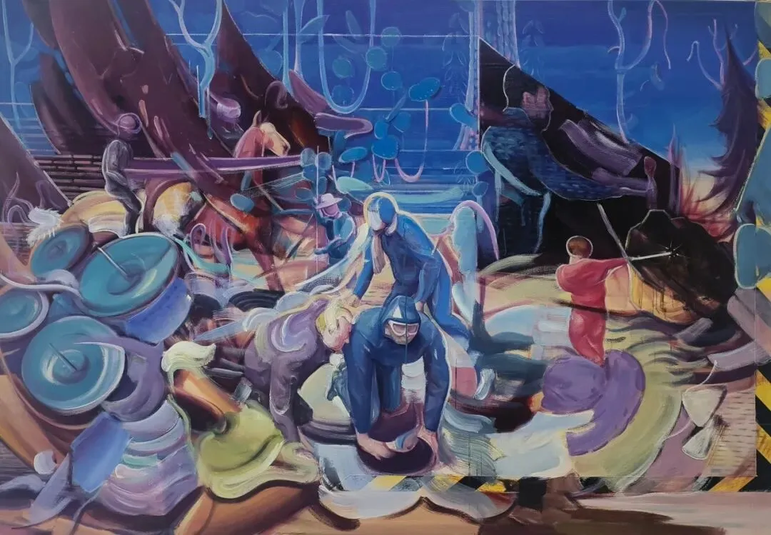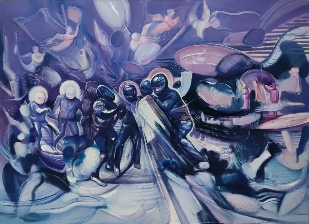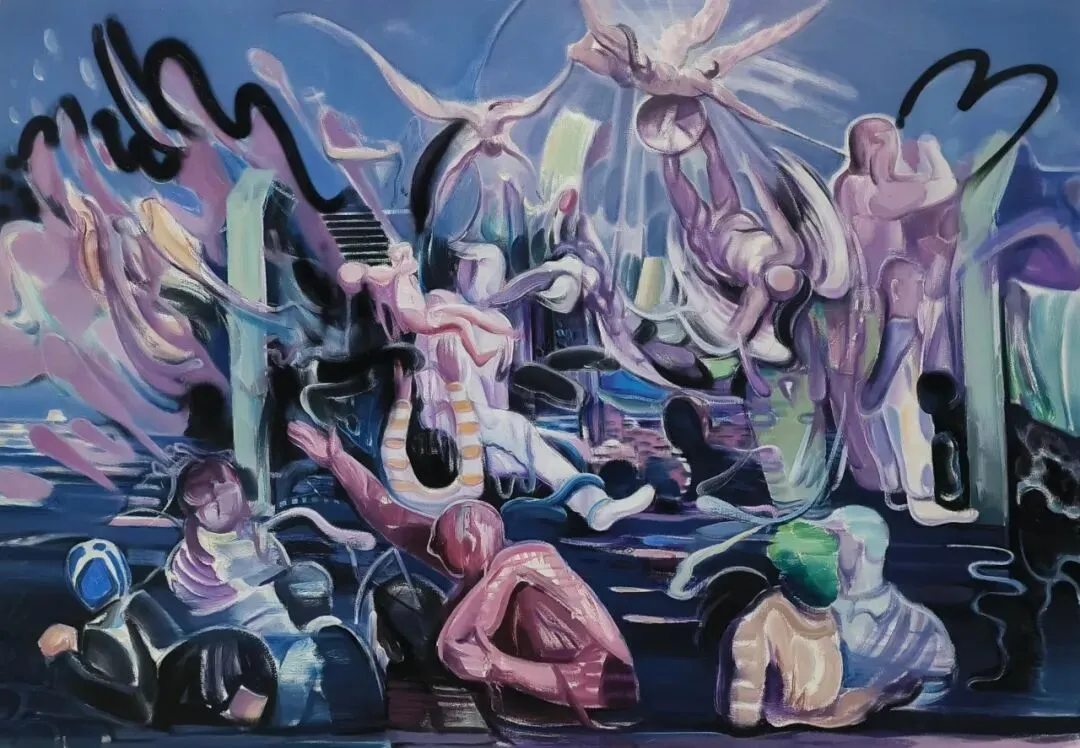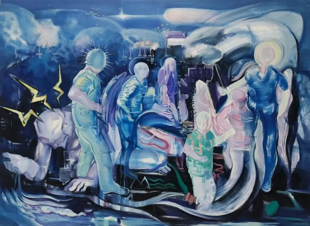 画面中运用了寓言式的表现形式,刻画在流放之地的一片热闹的浴场,这不只是地理上的边缘空间,更象征现代人的精神处境:一种与故土、传统或真实自我失去联结,充满异化、迷茫与身份焦虑的生存状态。画面蓝紫色调既像温润的水汽,又似天际积聚的雨云。艺术家将“流放之地”这一充满疏离和艰辛的意象,与“浴场”所代表的疗愈和喘息并置,建构了一个精神上的“阈限空间”,充分展现了人类的韧性。在一个不确定的危机四伏的环境,仍为自己创造片刻温暖和慰藉,并坦然接受这欢愉下潜藏的随时迸发的骤雨。画面人物姿态各异,或沉浸或舒展,与上空舞动的天使般的存在交织,这是人身上神性的体现,是在断壁残垣上寻找生机,在苦难中寻找意义,并将伤痕转化为力量的深刻生命本能的释放。