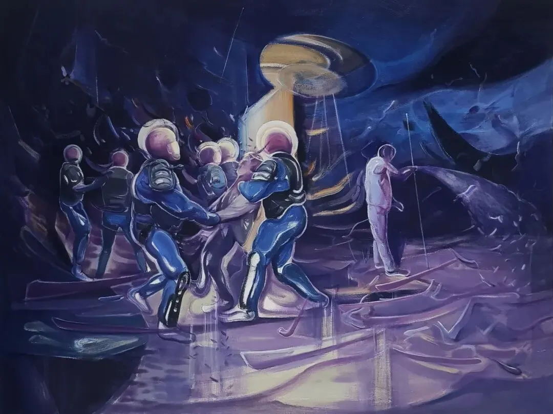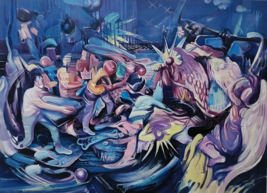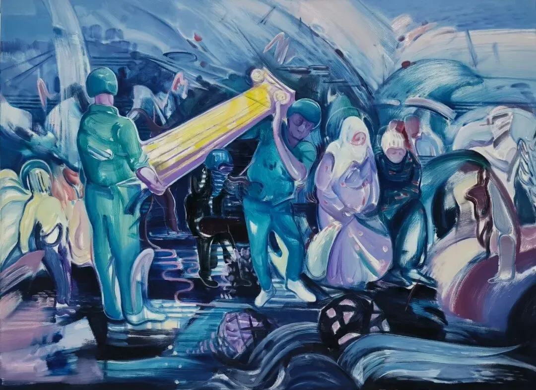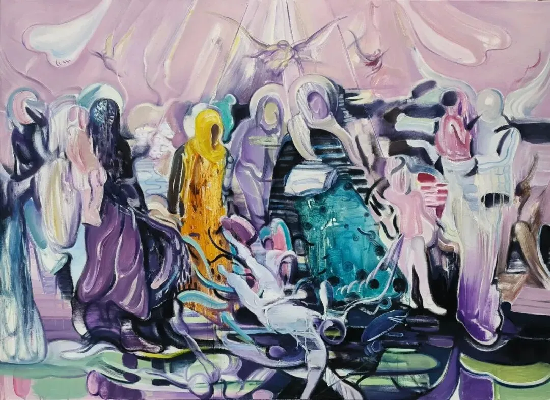 画面中运用了寓言式的表现形式,刻画在流放之地的一片热闹的浴场,这不只是地理上的边缘空间,更象征现代人的精神处境:一种与故土、传统或真实自我失去联结,充满异化、迷茫与身份焦虑的生存状态。画面蓝紫色调既像温润的水汽,又似天际积聚的雨云。艺术家将“流放之地”这一充满疏离和艰辛的意象,与“浴场”所代表的疗愈和喘息并置,建构了一个精神上的“阈限空间”,充分展现了人类的韧性。在一个不确定的危机四伏的环境,仍为自己创造片刻温暖和慰藉,并坦然接受这欢愉下潜藏的随时迸发的骤雨。画面人物姿态各异,或沉浸或舒展,与上空舞动的天使般的存在交织,这是人身上神性的体现,是在断壁残垣上寻找生机,在苦难中寻找意义,并将伤痕转化为力量的深刻生命本能的释放。