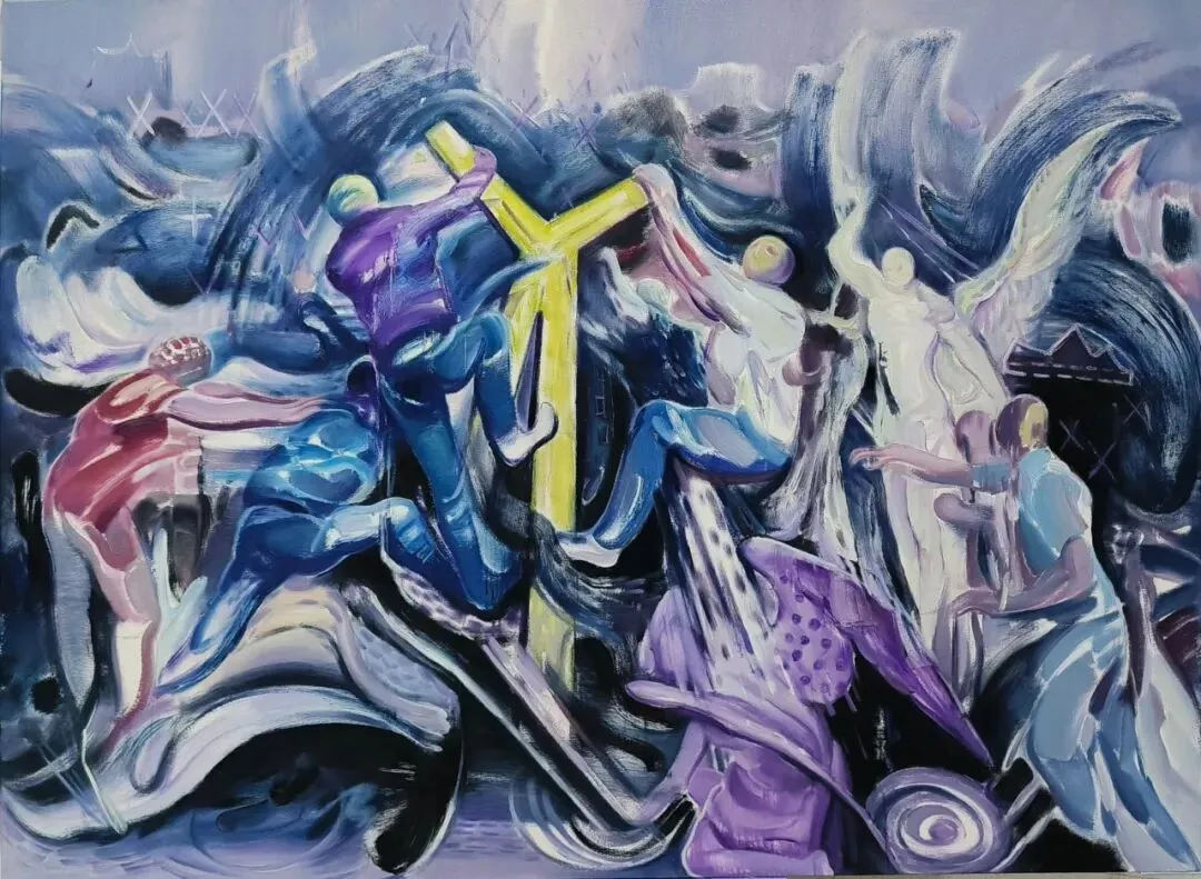 铁丝网围墙上的水泥构件、攀爬的人、争斗的天使、混乱的线条、天边的光束,这一切元素糅杂在一个空间,像被一个巨大的漩涡裹挟着走向未知。水泥构件以明亮的黄色呈现,成为整幅画的视觉焦点,这是信仰的支柱也是希望的象征。然而,作为围墙的一部分,它是冰冷的、毫无生气的,是具有隔离禁锢的本质功能属性。这引入了一层深刻的荒诞性和反思:我们所追逐的希望,我们精神上的“信仰支柱”,是否本身就是一种困境的产物?我们攀爬以求生,但攀爬的终点究竟是什么?作品没有简单给出答案。它忠实地记录了一种极端状态下的生命图景:在整体的、席卷一切的混沌中,个体与集体仍在进行着悲壮而执着的抗争。那束天边的光与黄色的支柱,并未承诺一个光明的结局,但它们的存在本身,就是对抗黑暗的意义。当世界陷入无序,当信仰本身开始争执,我们该如何自处?或许,答案就在于画中那些仍在奋力攀爬的姿态本身——即使被漩涡裹挟,向上的渴望和行动,便是人类尊严与希望最深刻的体现。
