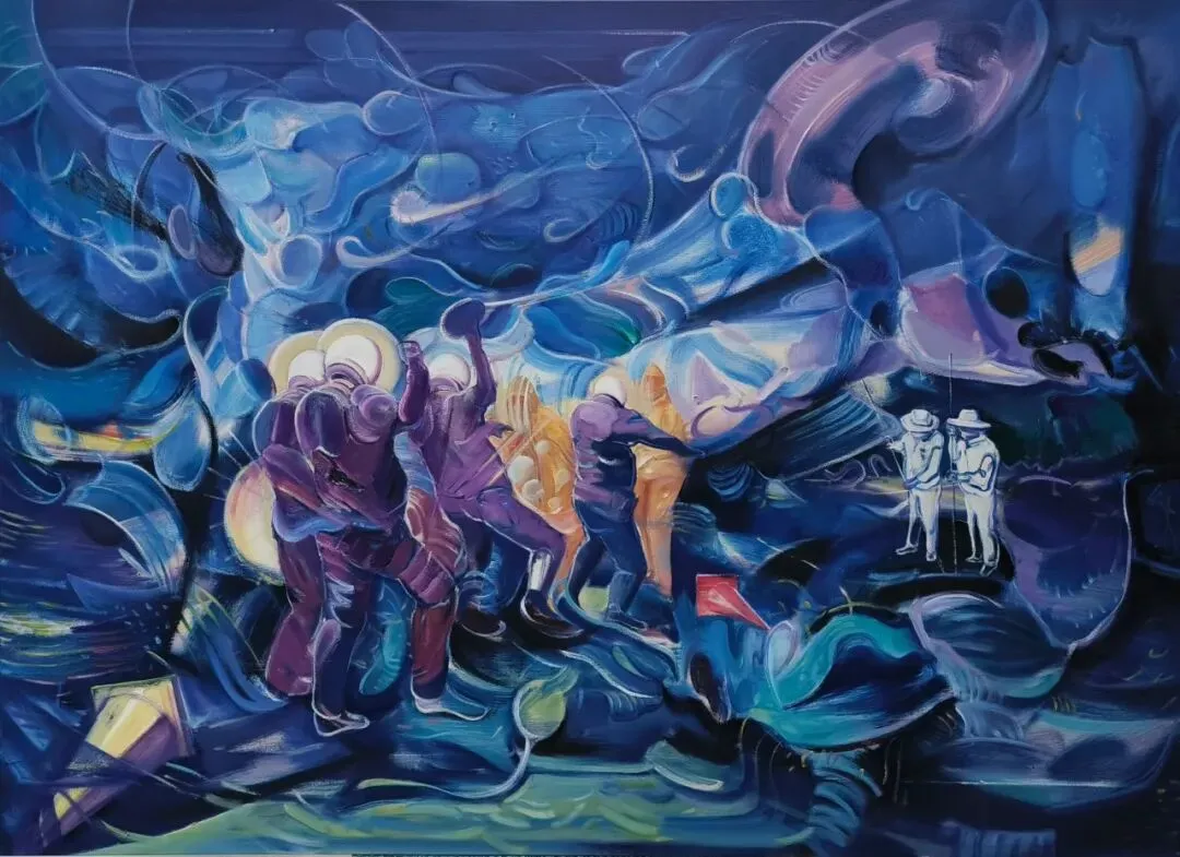 作品中的苦难是现在进行时的,是人们无法摆脱的重负,画面水平式、动态的构图,从左至右形成一条探索与行进的轴线,北极星高悬于远方,指引着人们一代又一代努力奔赴。前者是精神的奠基,后者是现实的行动。二者共同揭示了艺术家的核心关切:人类的伟大不在于永不坠落或永不受伤,而在于每次坠落后的深刻反思,以及每次受伤后,依然能仰望星光,背负着所有的沉重坚韧前行。