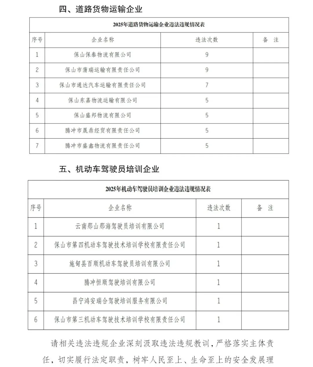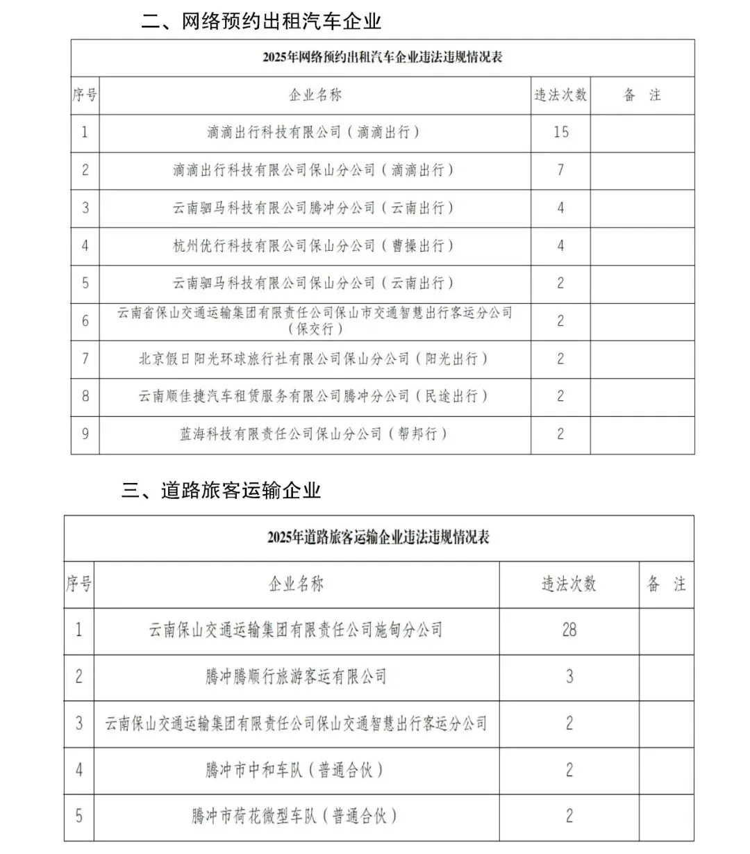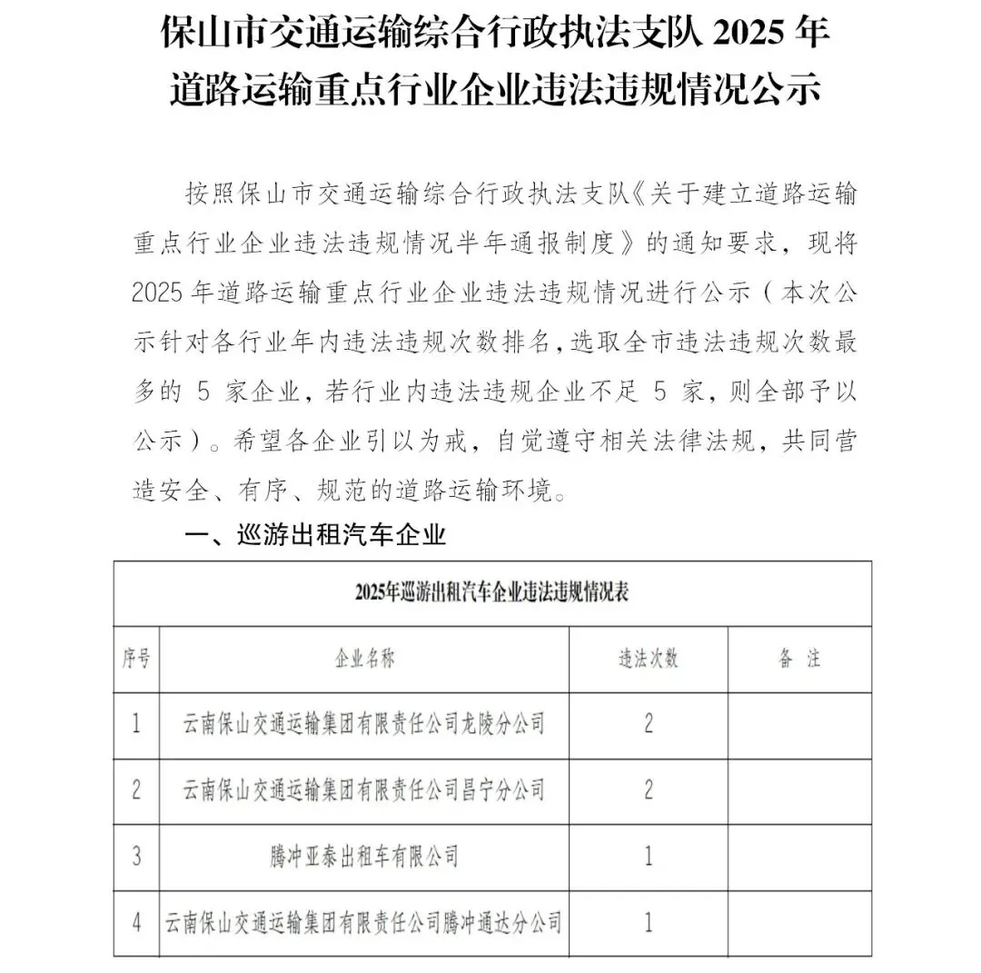 2025年道路运输重点行业企业违法违规情况公示