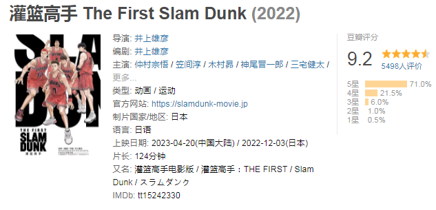 该片由原作者井上雄彦亲自执导,并担任编剧,木村昂、仲村宗悟、三宅健太等为角色配音。电影去年日本上映后连续八周周末斩获票房冠军,现在豆瓣已经有5000+人评分,口碑逆天9.2分!