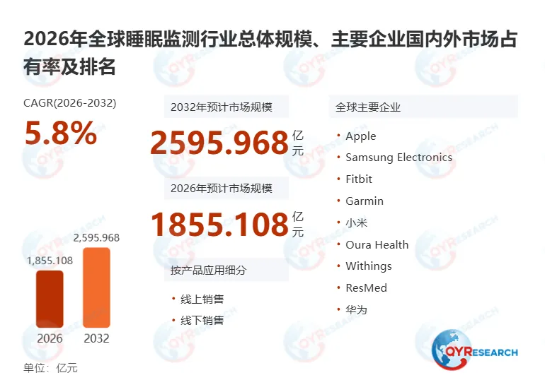 据QYResearch调研团队最新报告“全球睡眠监测市场报告2026-2032”显示,预计2032年全球睡眠监测市场规模将达到381.8亿美元,未来几年年复合增长率CAGR为5.76%。